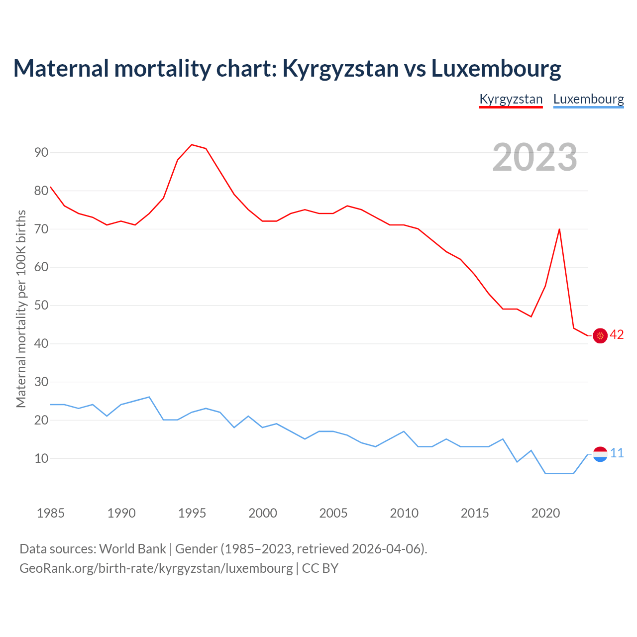 The maternal mortality rate, which is the probability of dying during childbirth or within 42 days of pregnancy termination, is 42 deaths per 100,000 live births in Kyrgyzstan, compared to 11 deaths in Luxembourg.