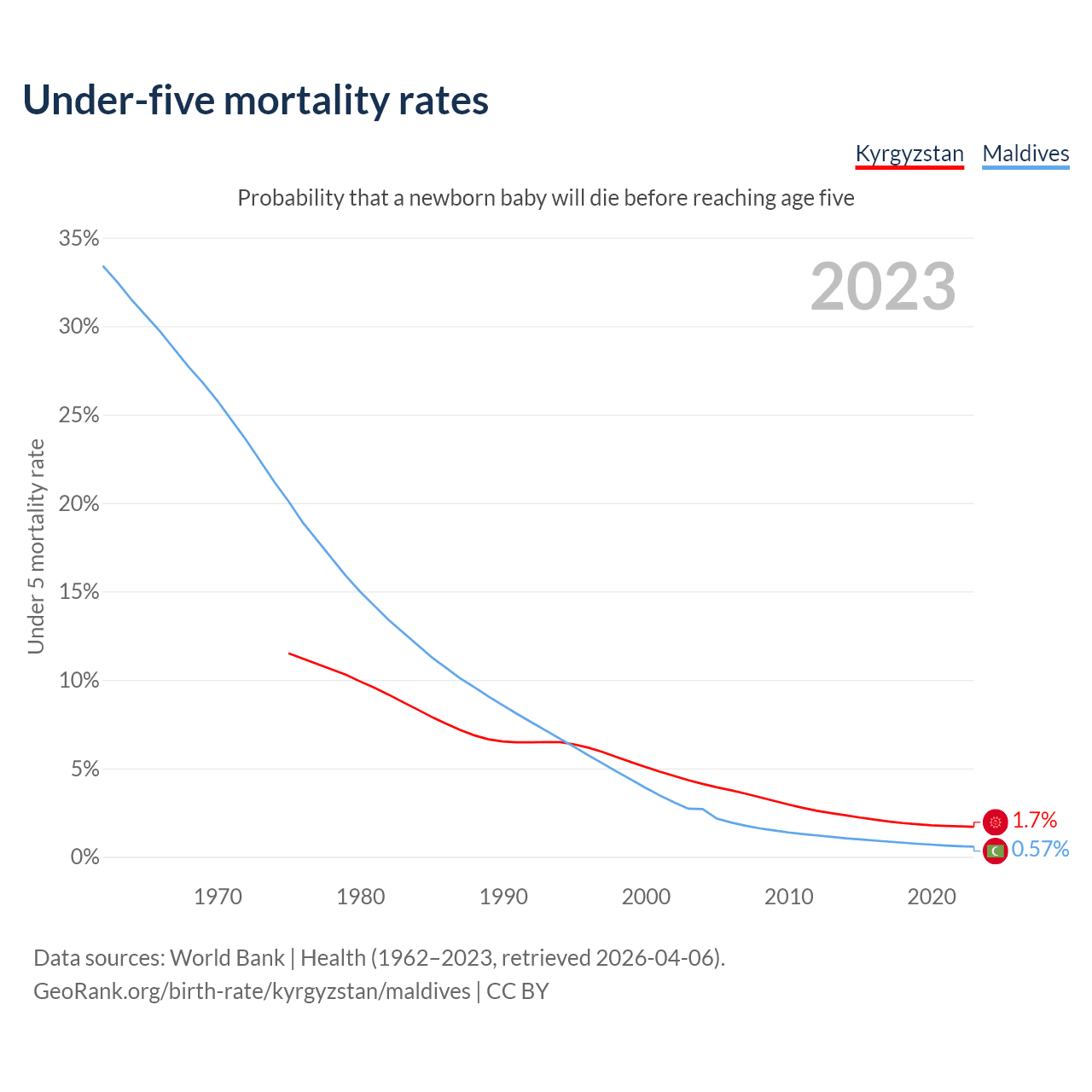 The chance that a newborn baby will die before reaching age five is 1.7% in Kyrgyzstan and 0.57% in Maldives. Above is a chart with historical data on under-five mortality rates.