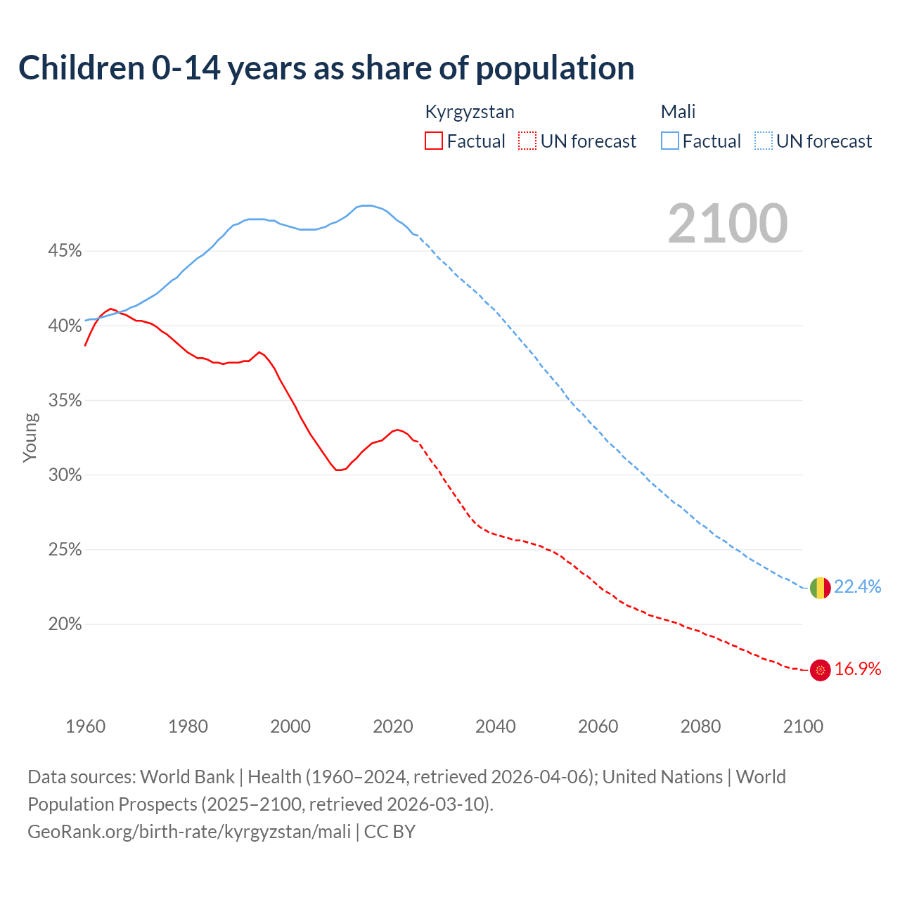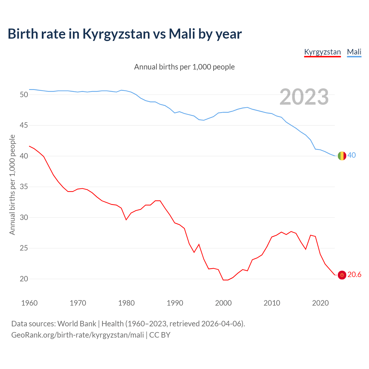 Kyrgyzstan has an annual birth rate of 20.6 births per 1,000 people, compared to 40 for Mali. The average number of children a woman is expected to have during her lifetime — the fertility rate, is 2.7 in Kyrgyzstan and 5.61 in Mali — 107.9% difference.