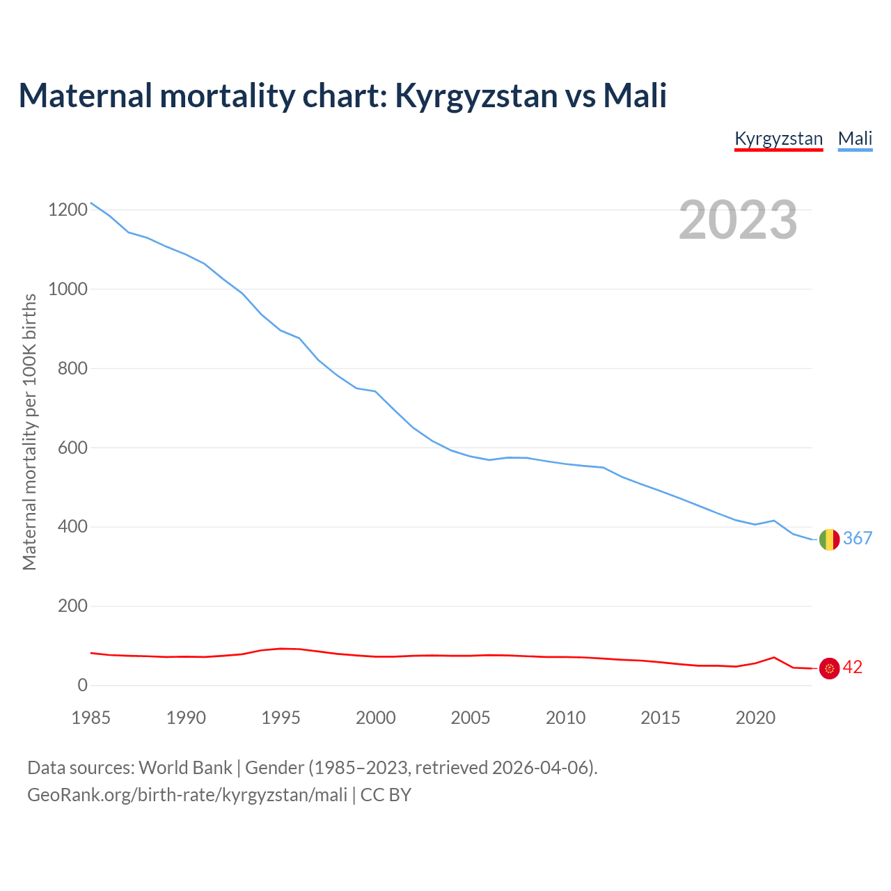 The maternal mortality rate, which is the probability of dying during childbirth or within 42 days of pregnancy termination, is 42 deaths per 100,000 live births in Kyrgyzstan, compared to 367 deaths in Mali.