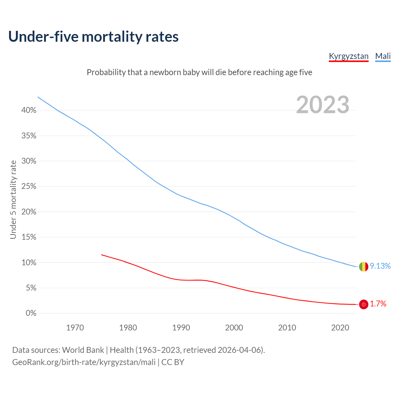 The chance that a newborn baby will die before reaching age five is 1.7% in Kyrgyzstan and 9.13% in Mali. Above is a chart with historical data on under-five mortality rates.