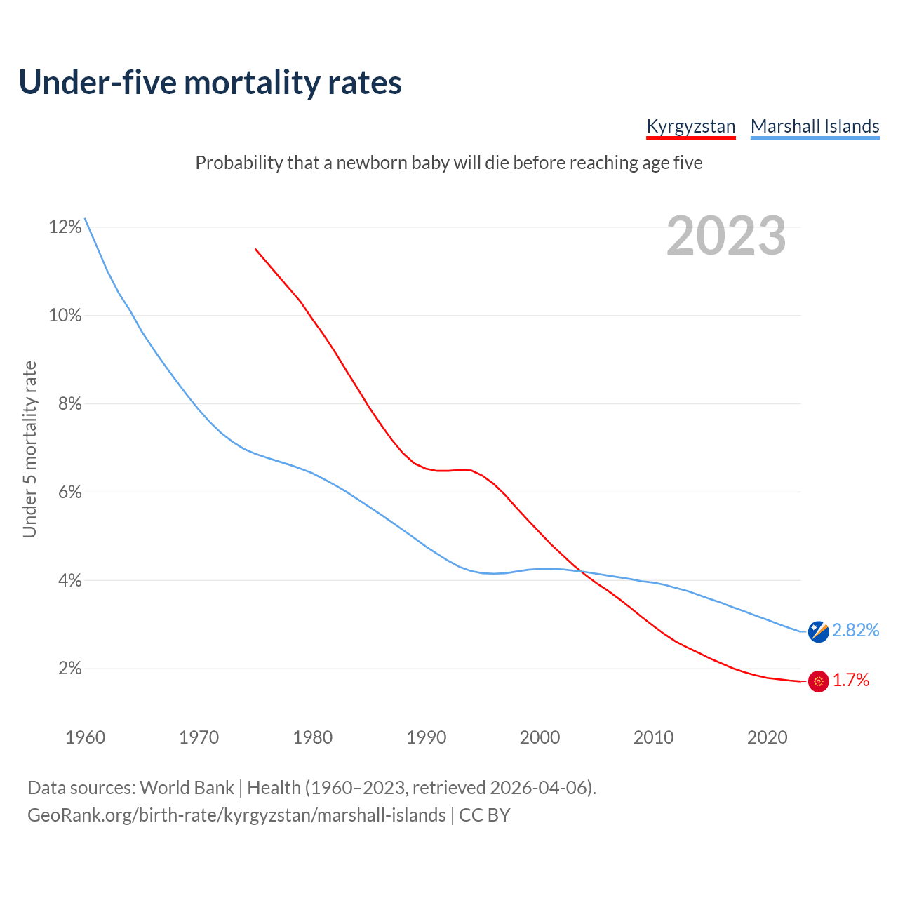 The chance that a newborn baby will die before reaching age five is 1.7% in Kyrgyzstan and 2.82% in the Marshall Islands. Above is a chart with historical data on under-five mortality rates.