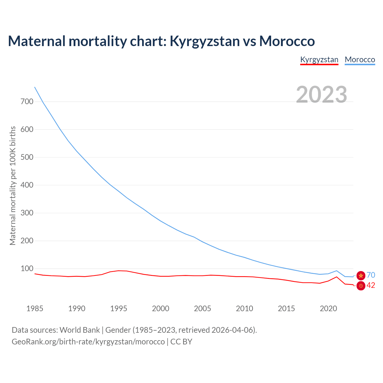 The maternal mortality rate, which is the probability of dying during childbirth or within 42 days of pregnancy termination, is 42 deaths per 100,000 live births in Kyrgyzstan, compared to 70 deaths in Morocco.