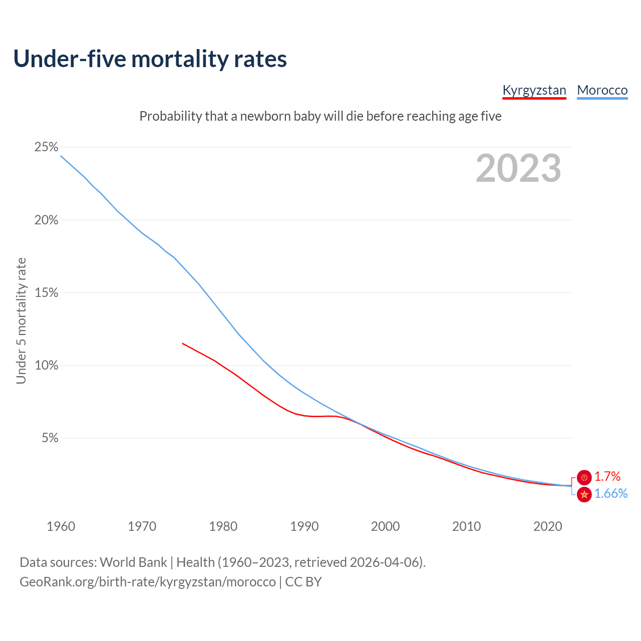 The chance that a newborn baby will die before reaching age five is 1.7% in Kyrgyzstan and 1.66% in Morocco. Above is a chart with historical data on under-five mortality rates.
