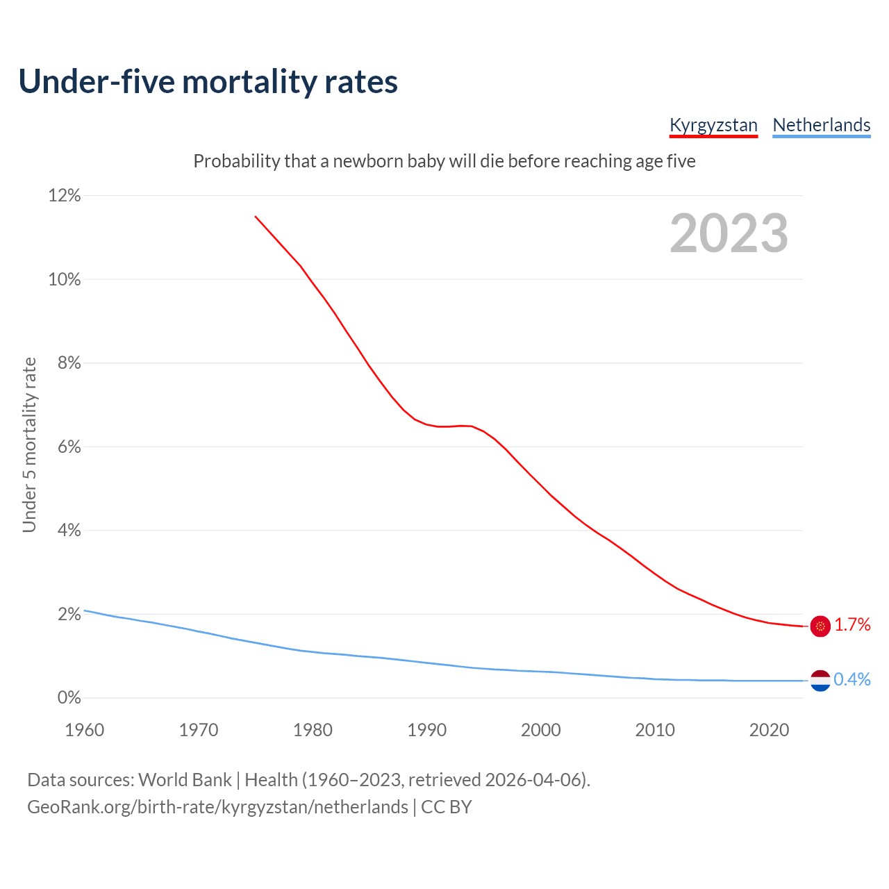 The chance that a newborn baby will die before reaching age five is 1.7% in Kyrgyzstan and 0.4% in the Netherlands. Above is a chart with historical data on under-five mortality rates.