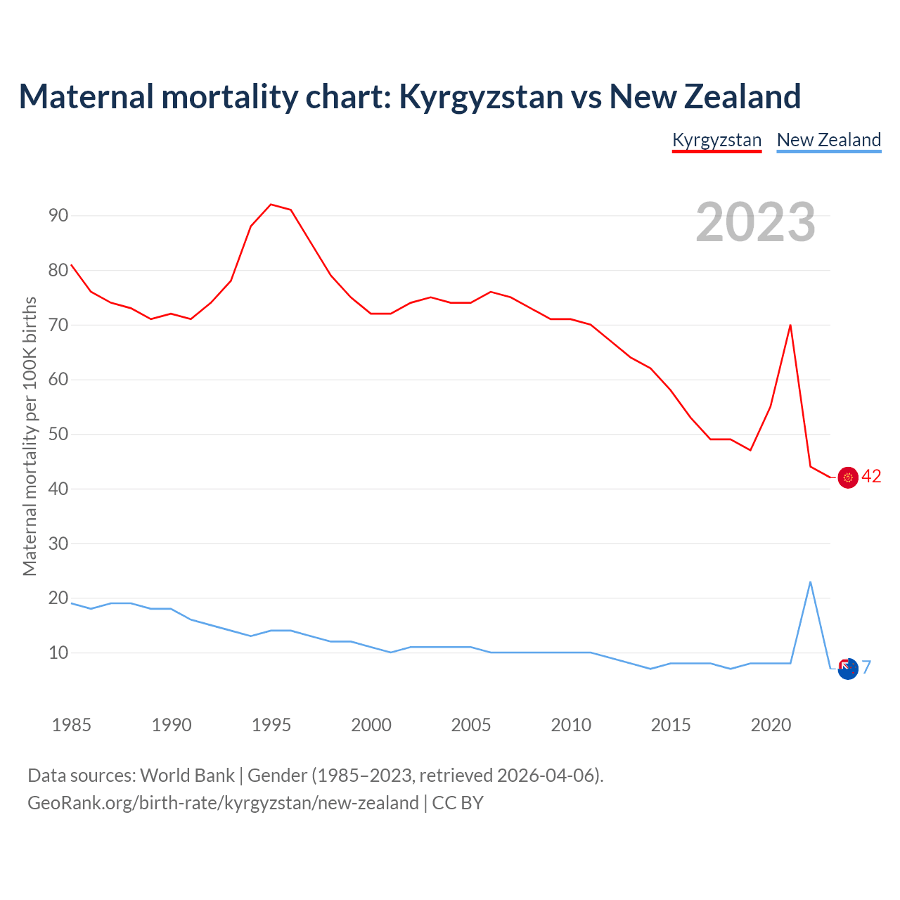 The maternal mortality rate, which is the probability of dying during childbirth or within 42 days of pregnancy termination, is 42 deaths per 100,000 live births in Kyrgyzstan, compared to 7 deaths in New Zealand.
