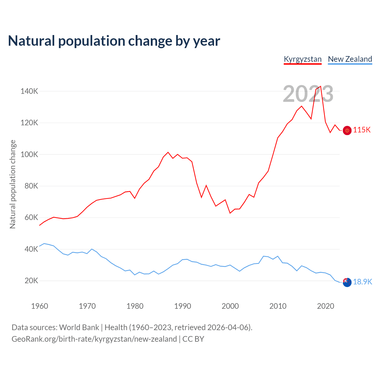 Kyrgyzstan has an annual birth rate of 20.6 births per 1,000 people, compared to 10.9 for New Zealand. The average number of children a woman is expected to have during her lifetime — the fertility rate, is 2.7 in Kyrgyzstan and 1.56 in New Zealand — 42.2% difference.