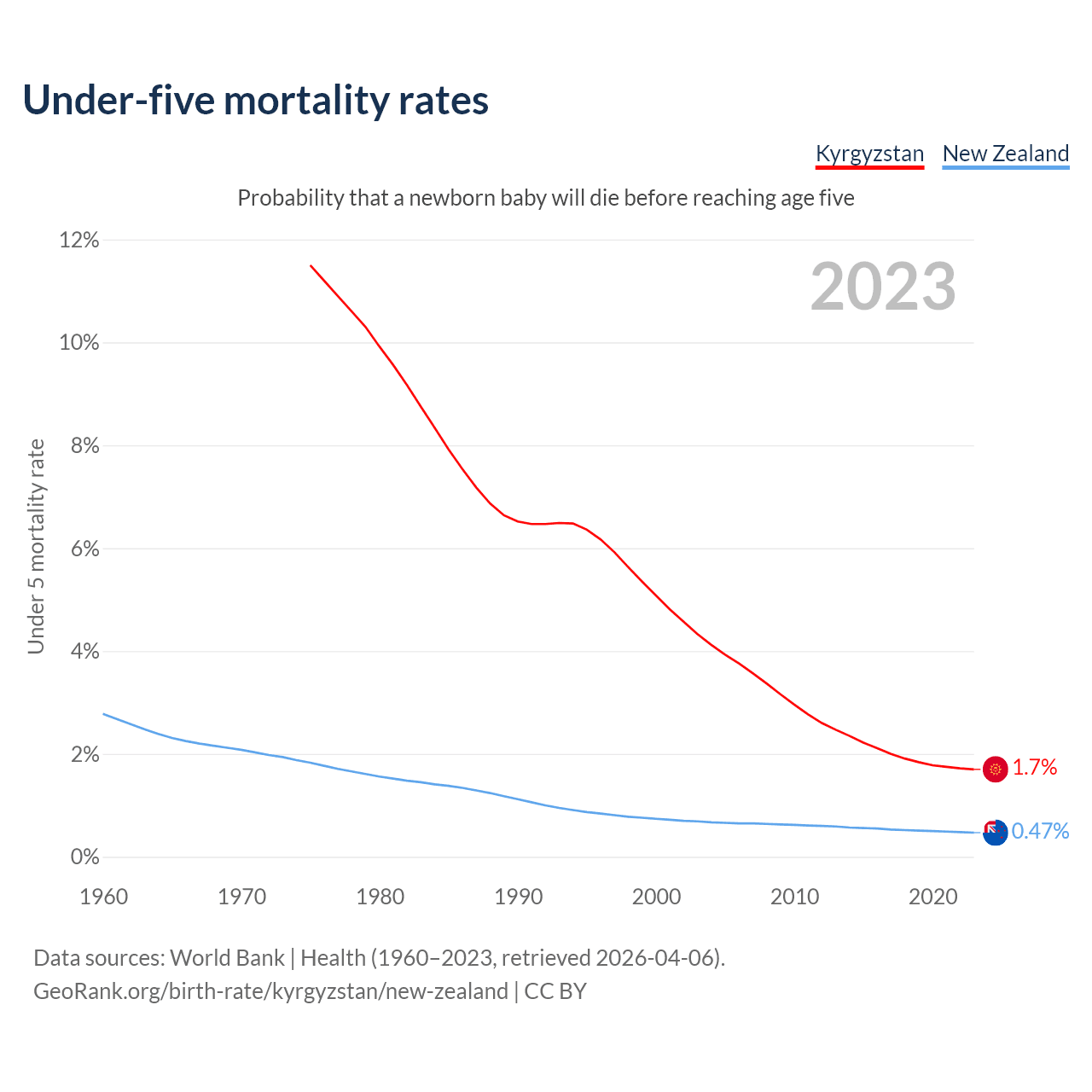 The chance that a newborn baby will die before reaching age five is 1.7% in Kyrgyzstan and 0.47% in New Zealand. Above is a chart with historical data on under-five mortality rates.