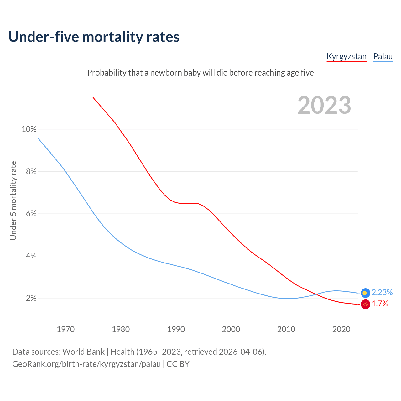 The chance that a newborn baby will die before reaching age five is 1.7% in Kyrgyzstan and 2.23% in Palau. Above is a chart with historical data on under-five mortality rates.