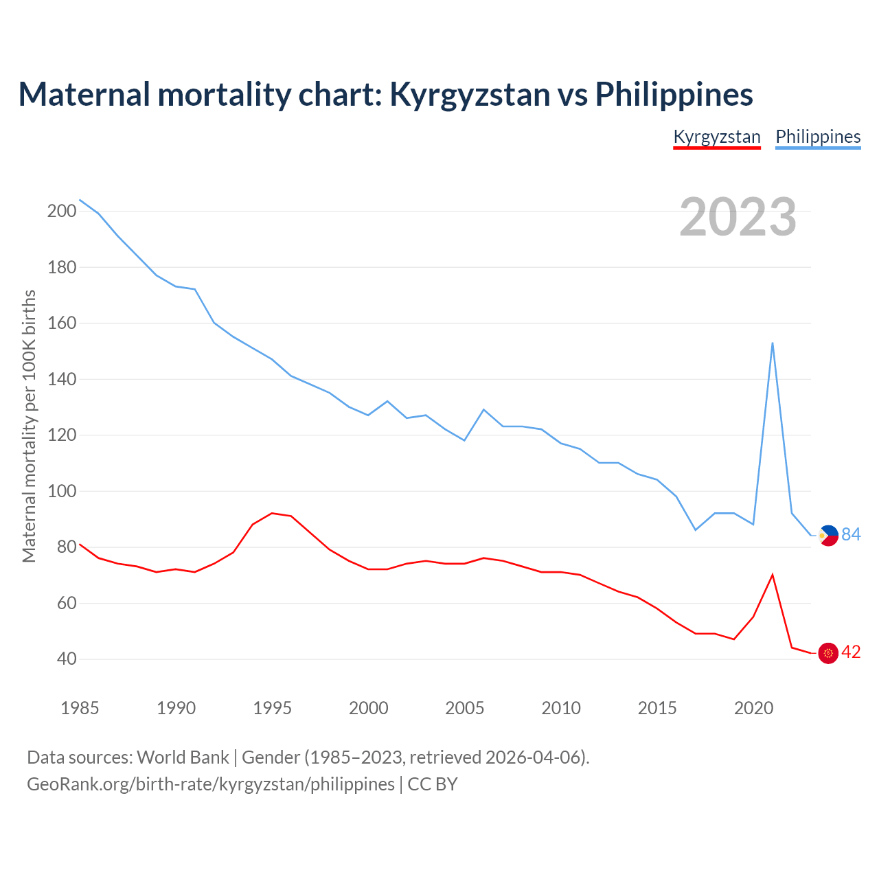 The maternal mortality rate, which is the probability of dying during childbirth or within 42 days of pregnancy termination, is 42 deaths per 100,000 live births in Kyrgyzstan, compared to 84 deaths in the Philippines.