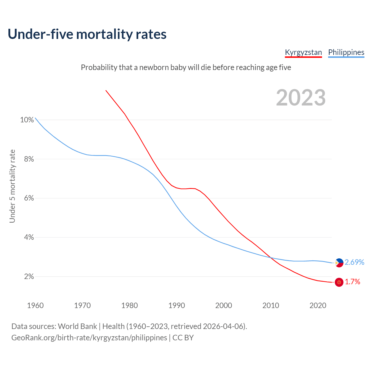 The chance that a newborn baby will die before reaching age five is 1.7% in Kyrgyzstan and 2.69% in the Philippines. Above is a chart with historical data on under-five mortality rates.