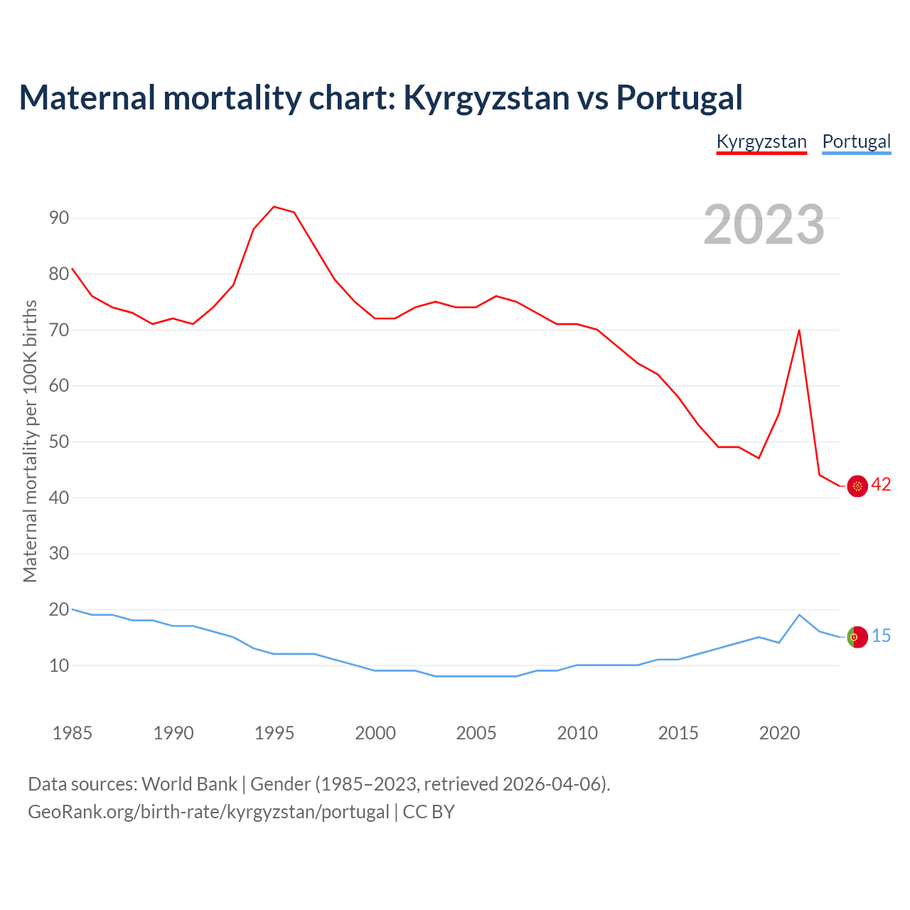 The maternal mortality rate, which is the probability of dying during childbirth or within 42 days of pregnancy termination, is 42 deaths per 100,000 live births in Kyrgyzstan, compared to 15 deaths in Portugal.