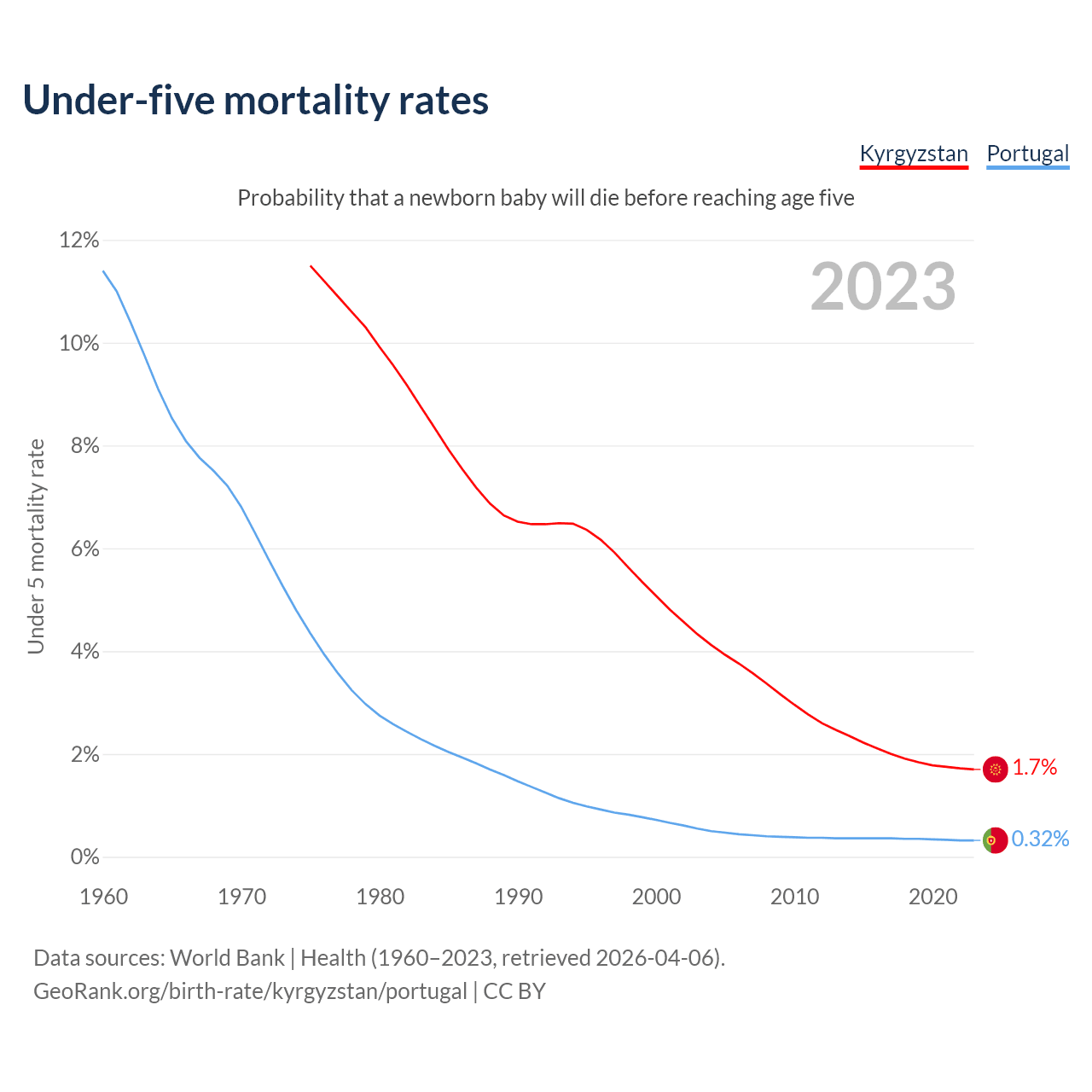 The chance that a newborn baby will die before reaching age five is 1.7% in Kyrgyzstan and 0.32% in Portugal. Above is a chart with historical data on under-five mortality rates.