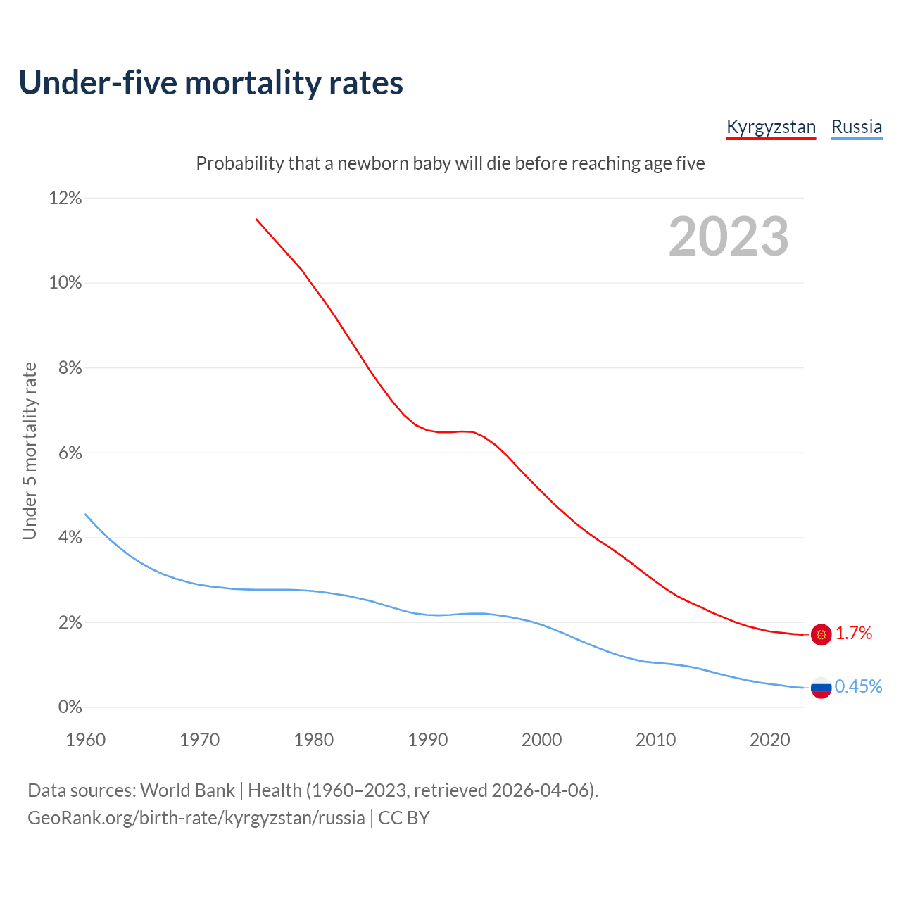 The chance that a newborn baby will die before reaching age five is 1.7% in Kyrgyzstan and 0.45% in Russia. Above is a chart with historical data on under-five mortality rates.