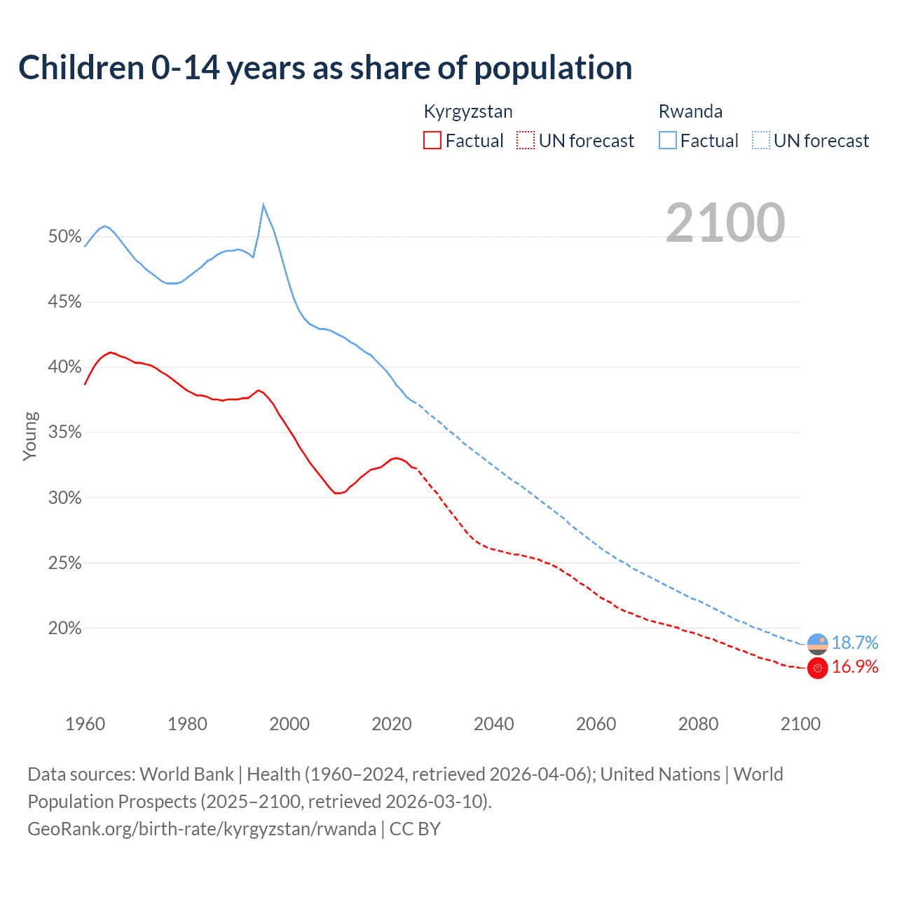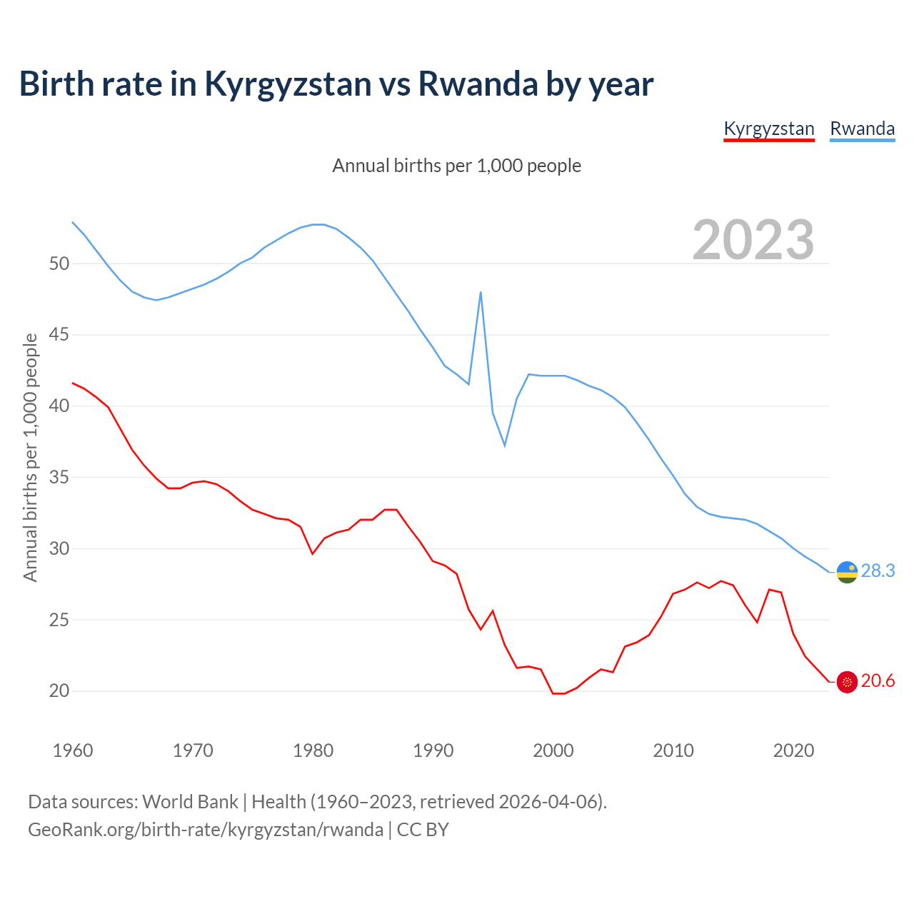 Kyrgyzstan has an annual birth rate of 20.6 births per 1,000 people, compared to 28.3 for Rwanda. The average number of children a woman is expected to have during her lifetime — the fertility rate, is 2.7 in Kyrgyzstan and 3.7 in Rwanda — 37% difference.