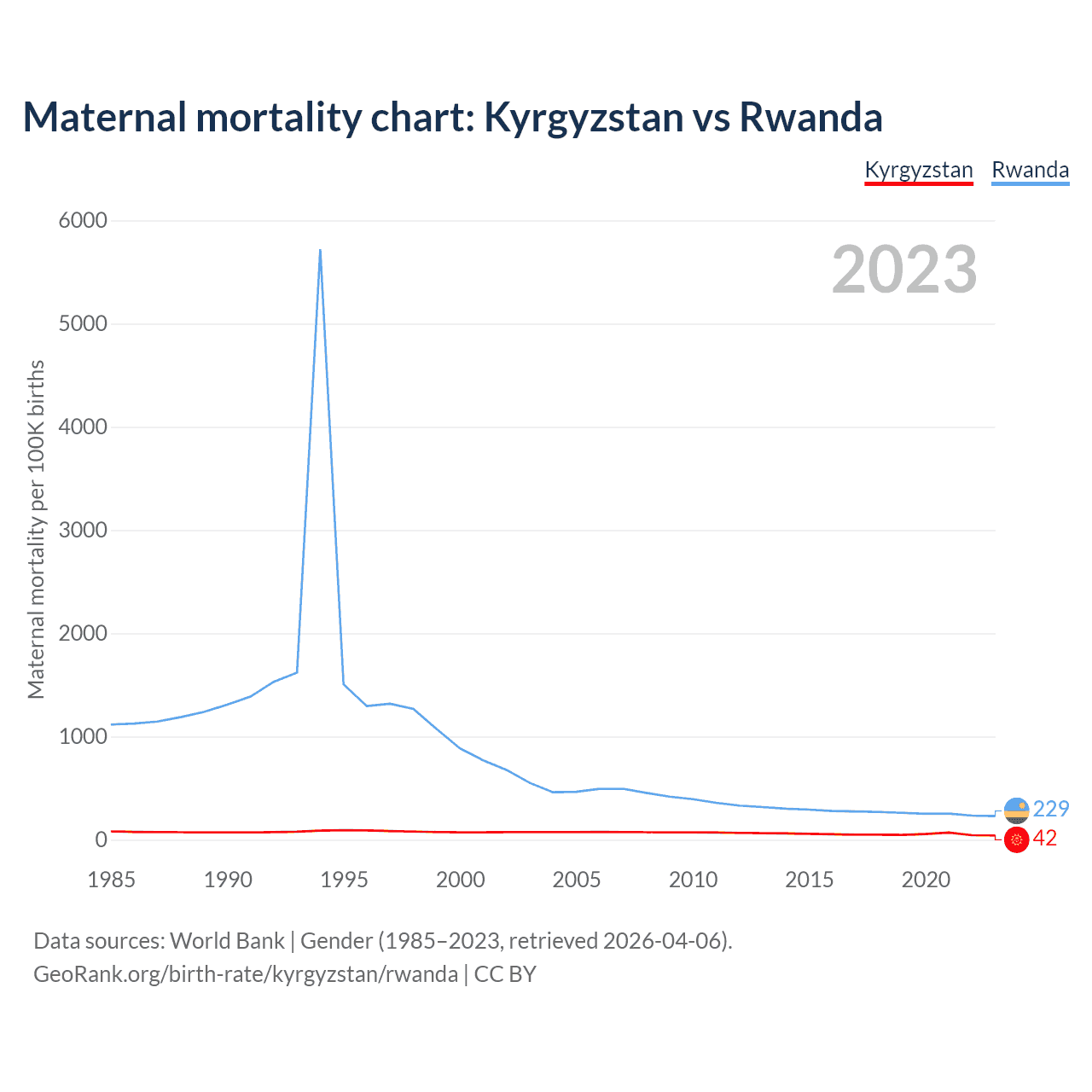 - Annual births per 1,000 women ages 15-19 (adolescent birth rate or teenage mother rate) is 28.3 in Kyrgyzstan vs 30.8 in Rwanda.