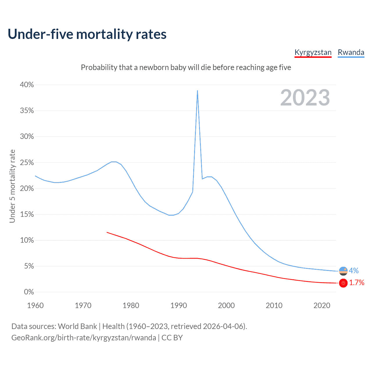 The chance that a newborn baby will die before reaching age five is 1.7% in Kyrgyzstan and 4% in Rwanda. Above is a chart with historical data on under-five mortality rates.