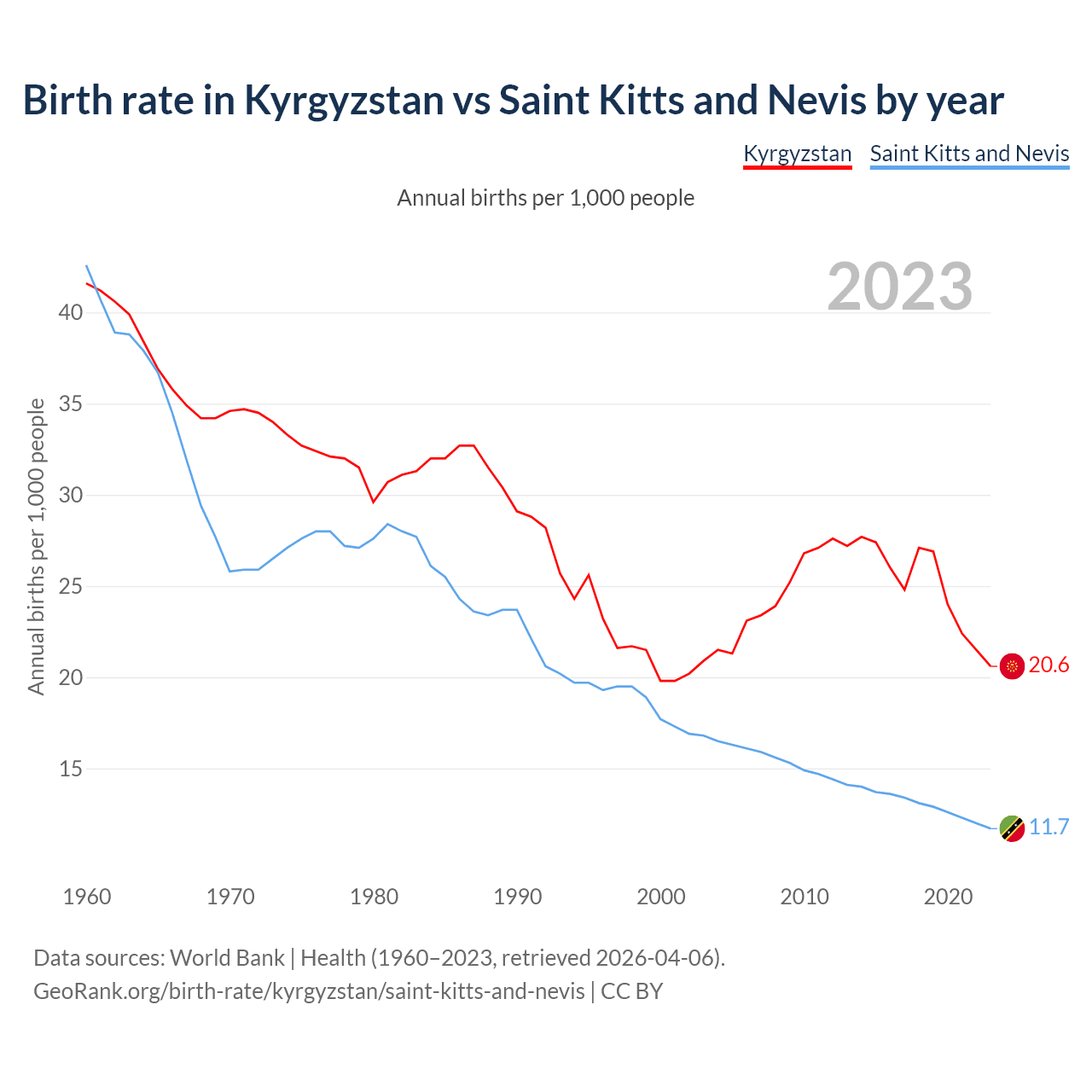 Kyrgyzstan has an annual birth rate of 20.6 births per 1,000 people, compared to 11.7 for Saint Kitts and Nevis. The average number of children a woman is expected to have during her lifetime — the fertility rate, is 2.7 in Kyrgyzstan and 1.51 in Saint Kitts and Nevis — 44.3% difference.