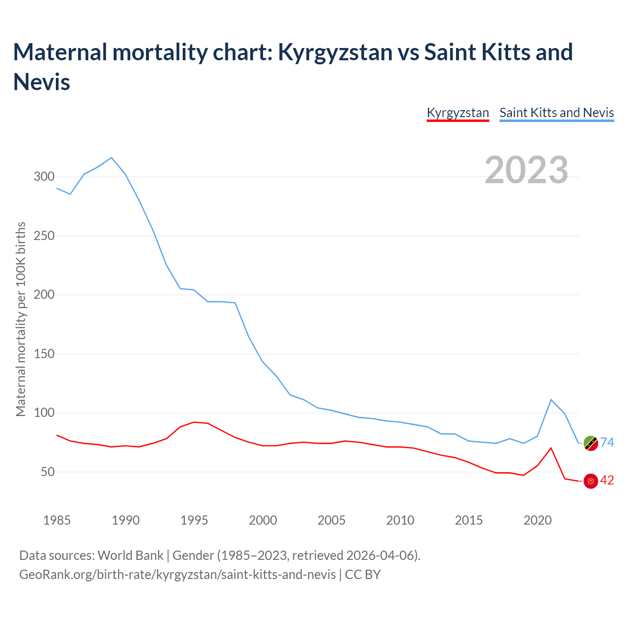 The maternal mortality rate, which is the probability of dying during childbirth or within 42 days of pregnancy termination, is 42 deaths per 100,000 live births in Kyrgyzstan, compared to 74 deaths in Saint Kitts and Nevis.