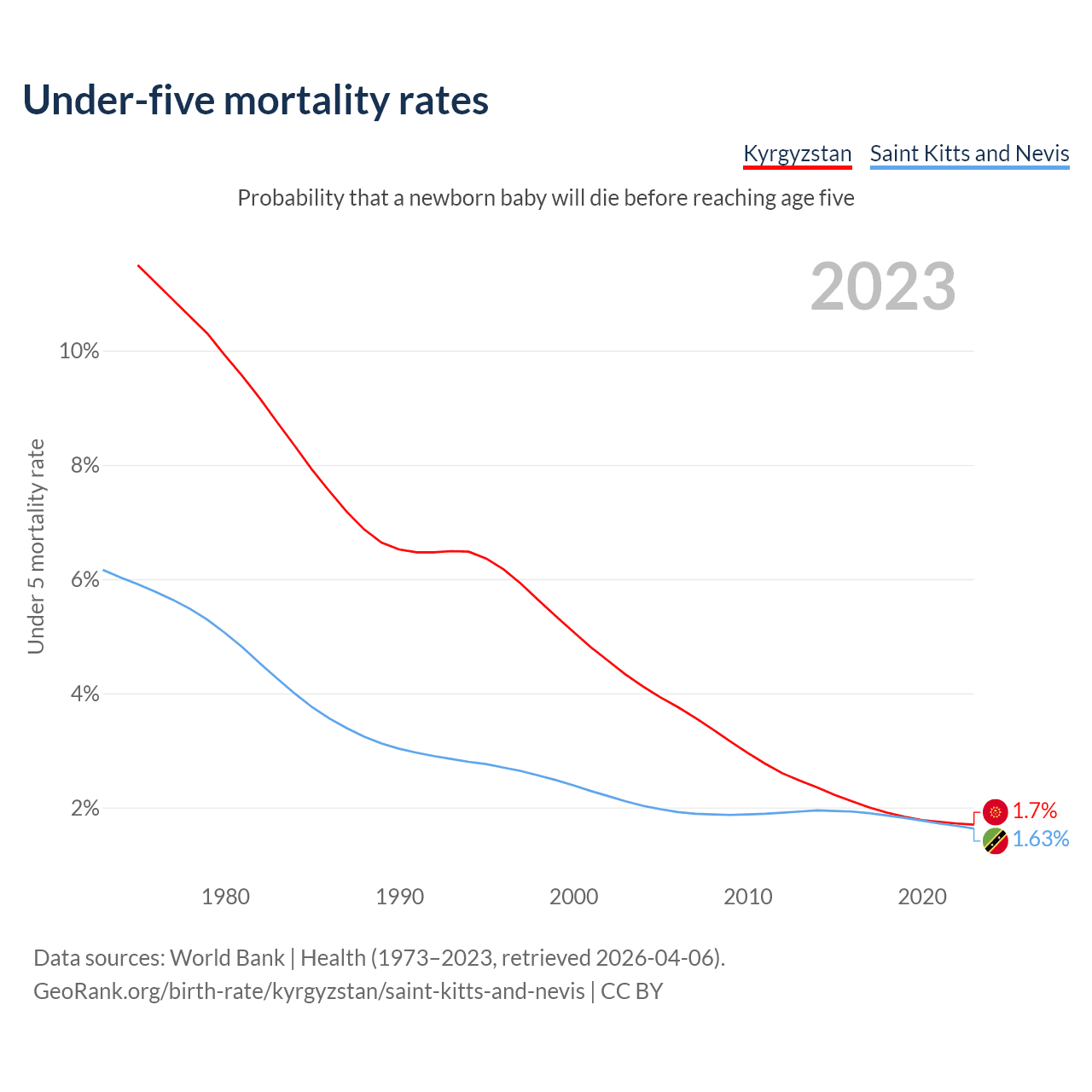 The chance that a newborn baby will die before reaching age five is 1.7% in Kyrgyzstan and 1.63% in Saint Kitts and Nevis. Above is a chart with historical data on under-five mortality rates.