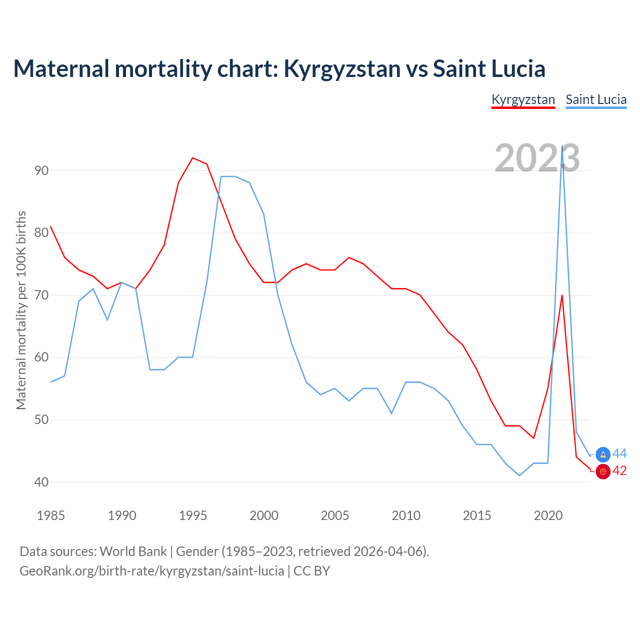 The maternal mortality rate, which is the probability of dying during childbirth or within 42 days of pregnancy termination, is 42 deaths per 100,000 live births in Kyrgyzstan, compared to 44 deaths in Saint Lucia.
