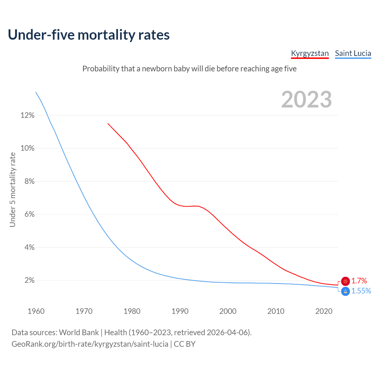 The chance that a newborn baby will die before reaching age five is 1.7% in Kyrgyzstan and 1.55% in Saint Lucia. Above is a chart with historical data on under-five mortality rates.