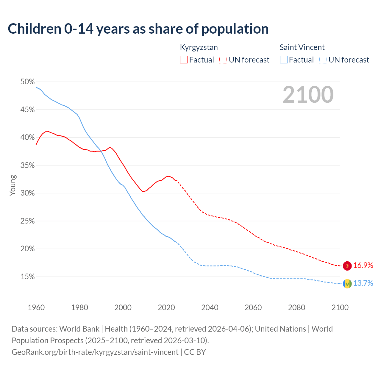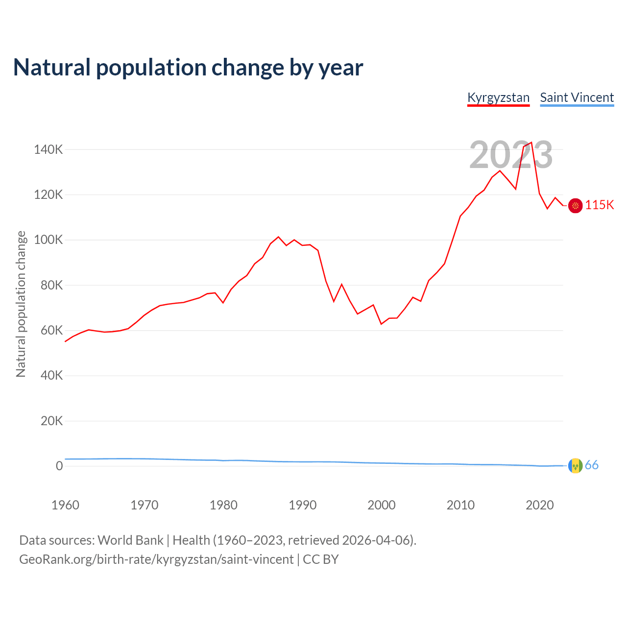 According to the latest available data on birth rates, the fertility rate in Kyrgyzstan was 2.7 children per woman in 2023, compared to 1.78 in Saint Vincent in 2023. The replacement level is considered to be 2.1 children per woman.