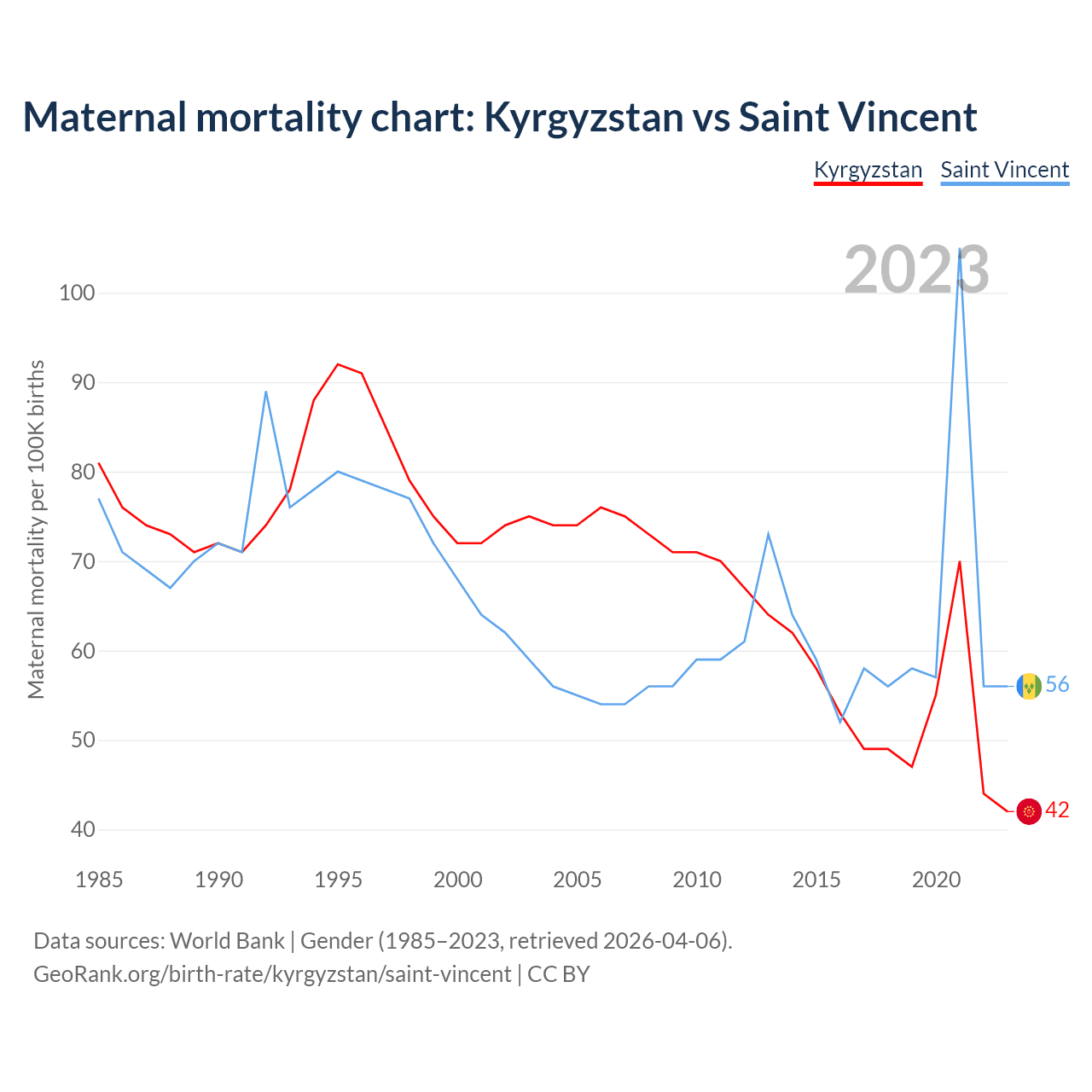 The maternal mortality rate, which is the probability of dying during childbirth or within 42 days of pregnancy termination, is 42 deaths per 100,000 live births in Kyrgyzstan, compared to 56 deaths in Saint Vincent.