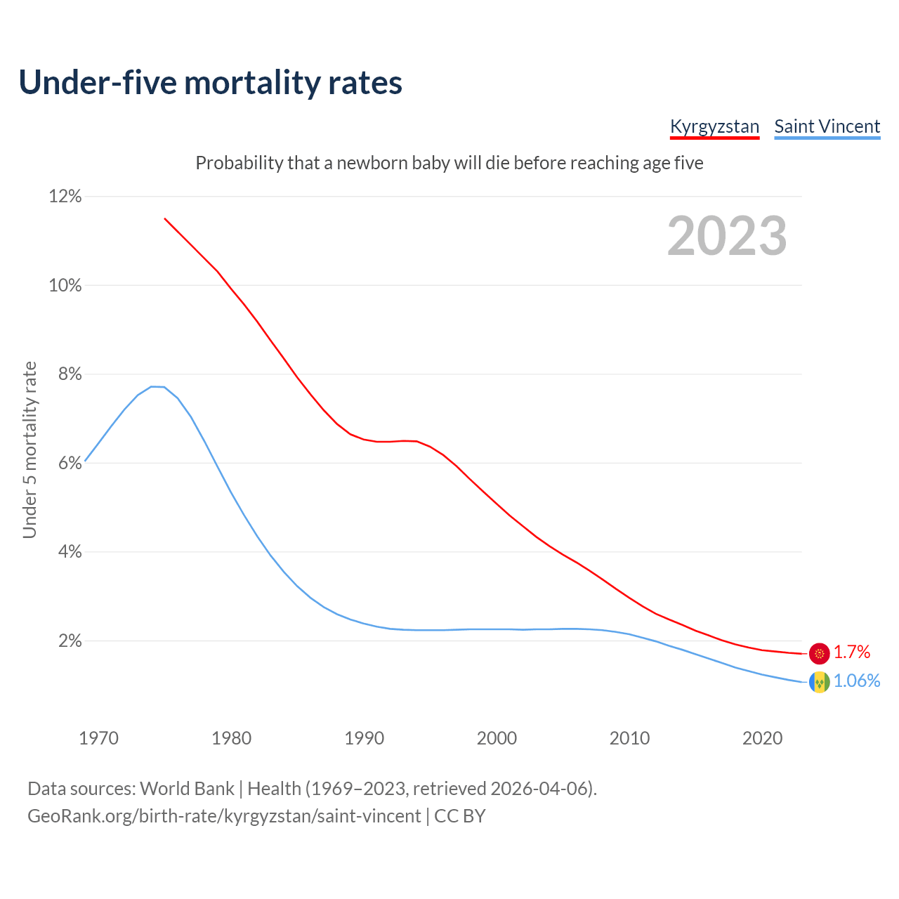 The chance that a newborn baby will die before reaching age five is 1.7% in Kyrgyzstan and 1.06% in Saint Vincent. Above is a chart with historical data on under-five mortality rates.