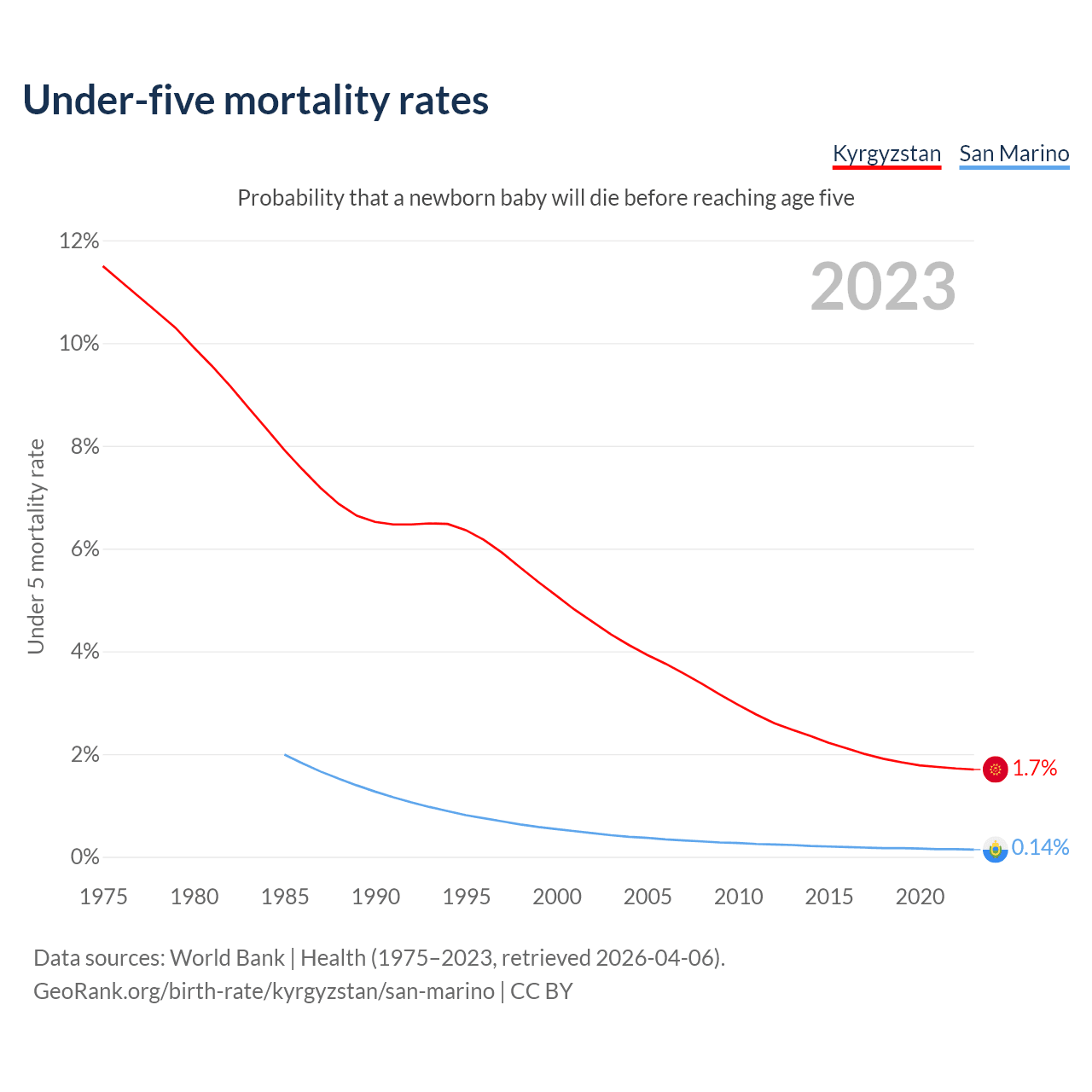 The chance that a newborn baby will die before reaching age five is 1.7% in Kyrgyzstan and 0.14% in San Marino. Above is a chart with historical data on under-five mortality rates.