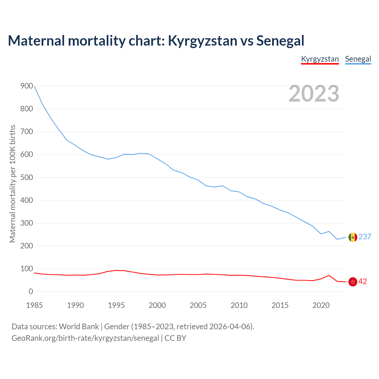 The maternal mortality rate, which is the probability of dying during childbirth or within 42 days of pregnancy termination, is 42 deaths per 100,000 live births in Kyrgyzstan, compared to 237 deaths in Senegal.