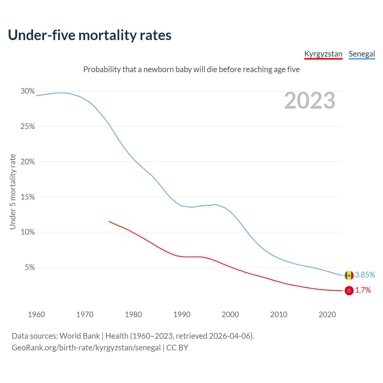 The chance that a newborn baby will die before reaching age five is 1.7% in Kyrgyzstan and 3.85% in Senegal. Above is a chart with historical data on under-five mortality rates.