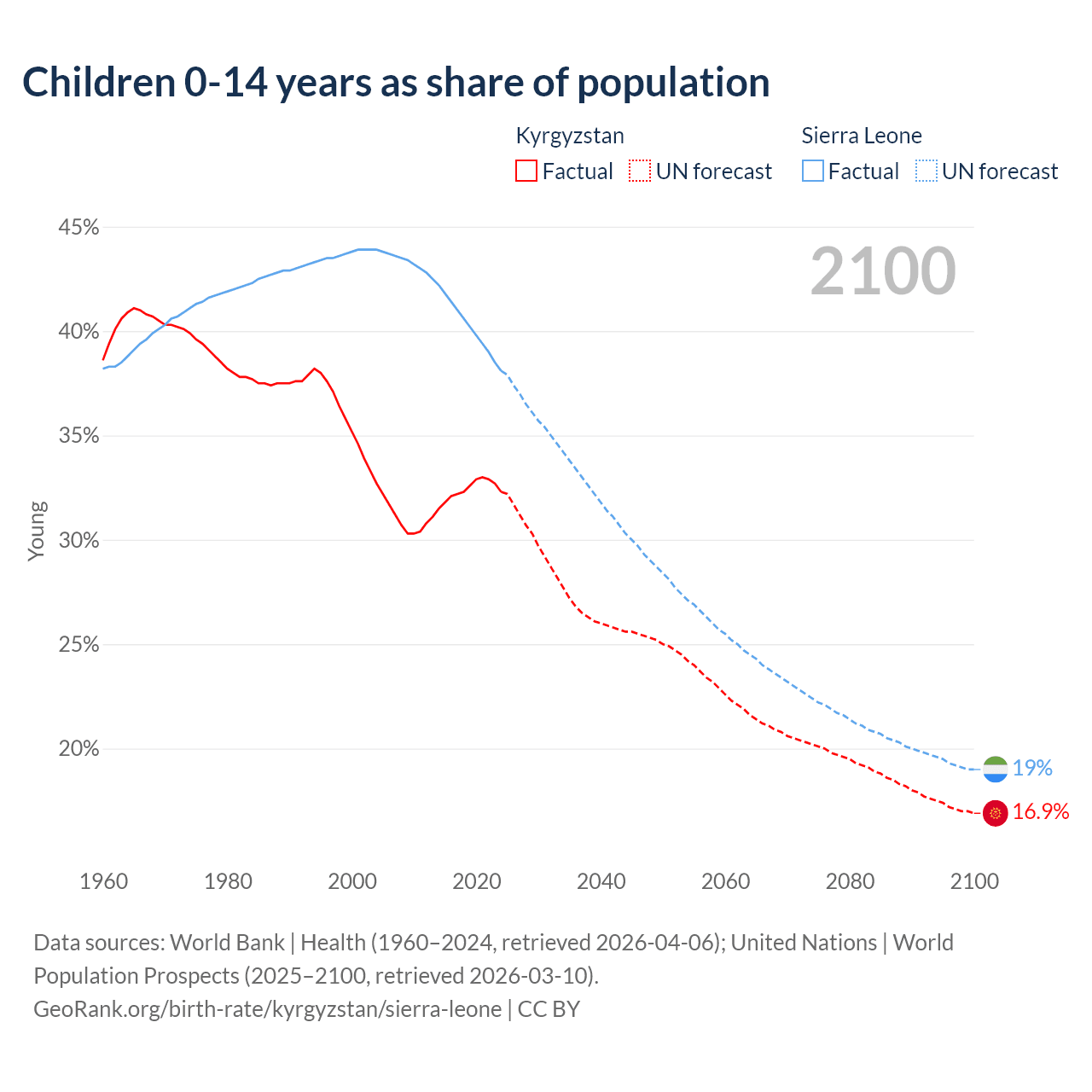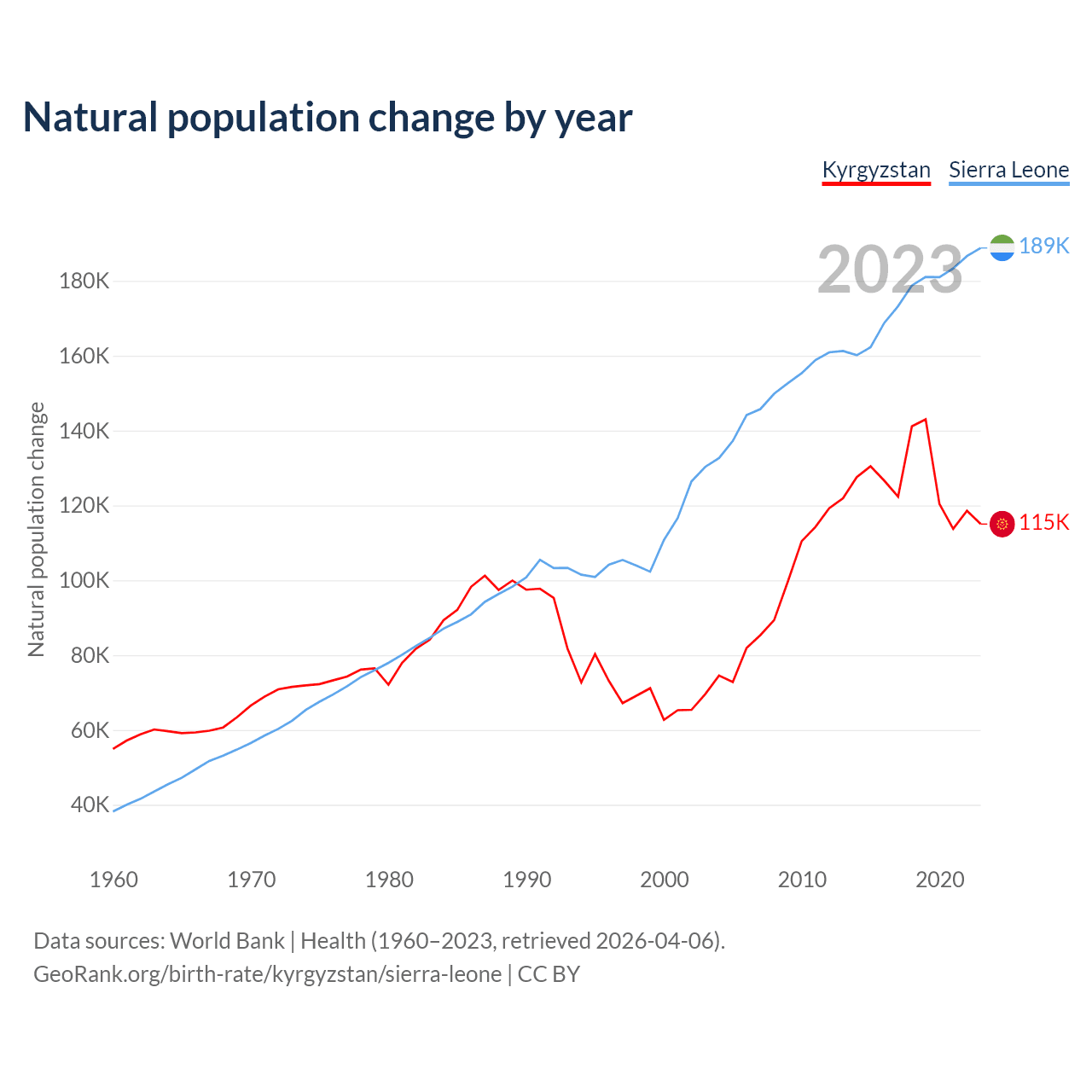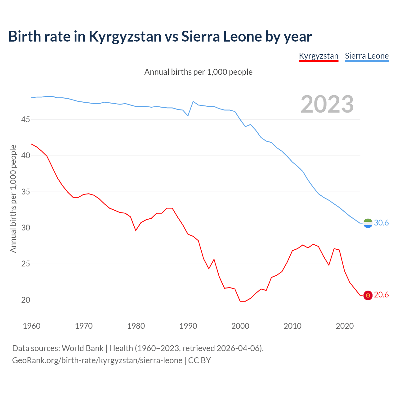 Kyrgyzstan has an annual birth rate of 20.6 births per 1,000 people, compared to 30.6 for Sierra Leone. The average number of children a woman is expected to have during her lifetime — the fertility rate, is 2.7 in Kyrgyzstan and 3.79 in Sierra Leone — 40.4% difference.