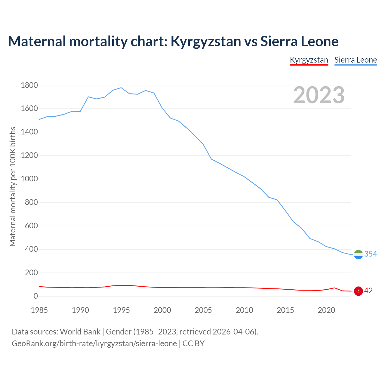 The maternal mortality rate, which is the probability of dying during childbirth or within 42 days of pregnancy termination, is 42 deaths per 100,000 live births in Kyrgyzstan, compared to 354 deaths in Sierra Leone.