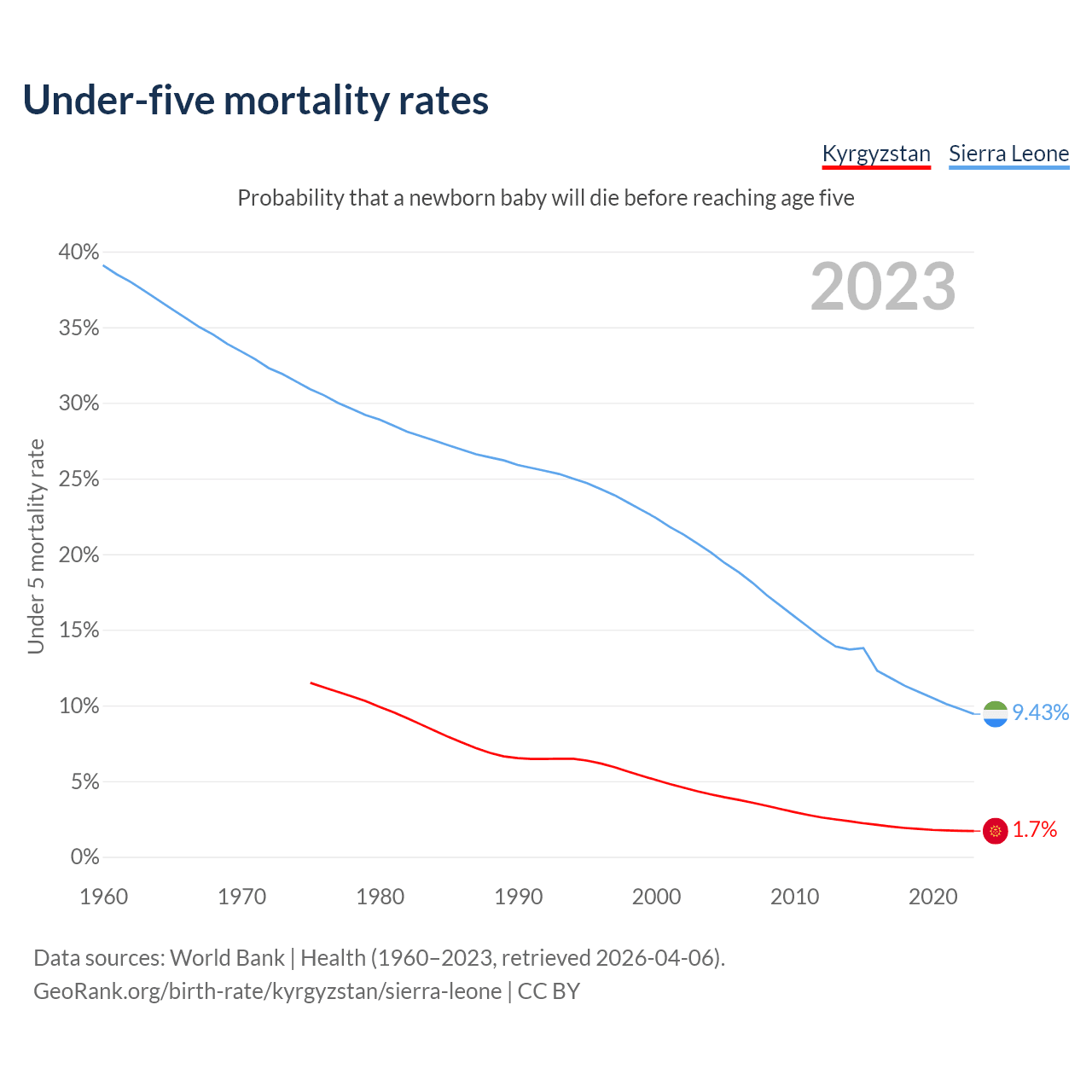 The chance that a newborn baby will die before reaching age five is 1.7% in Kyrgyzstan and 9.43% in Sierra Leone. Above is a chart with historical data on under-five mortality rates.