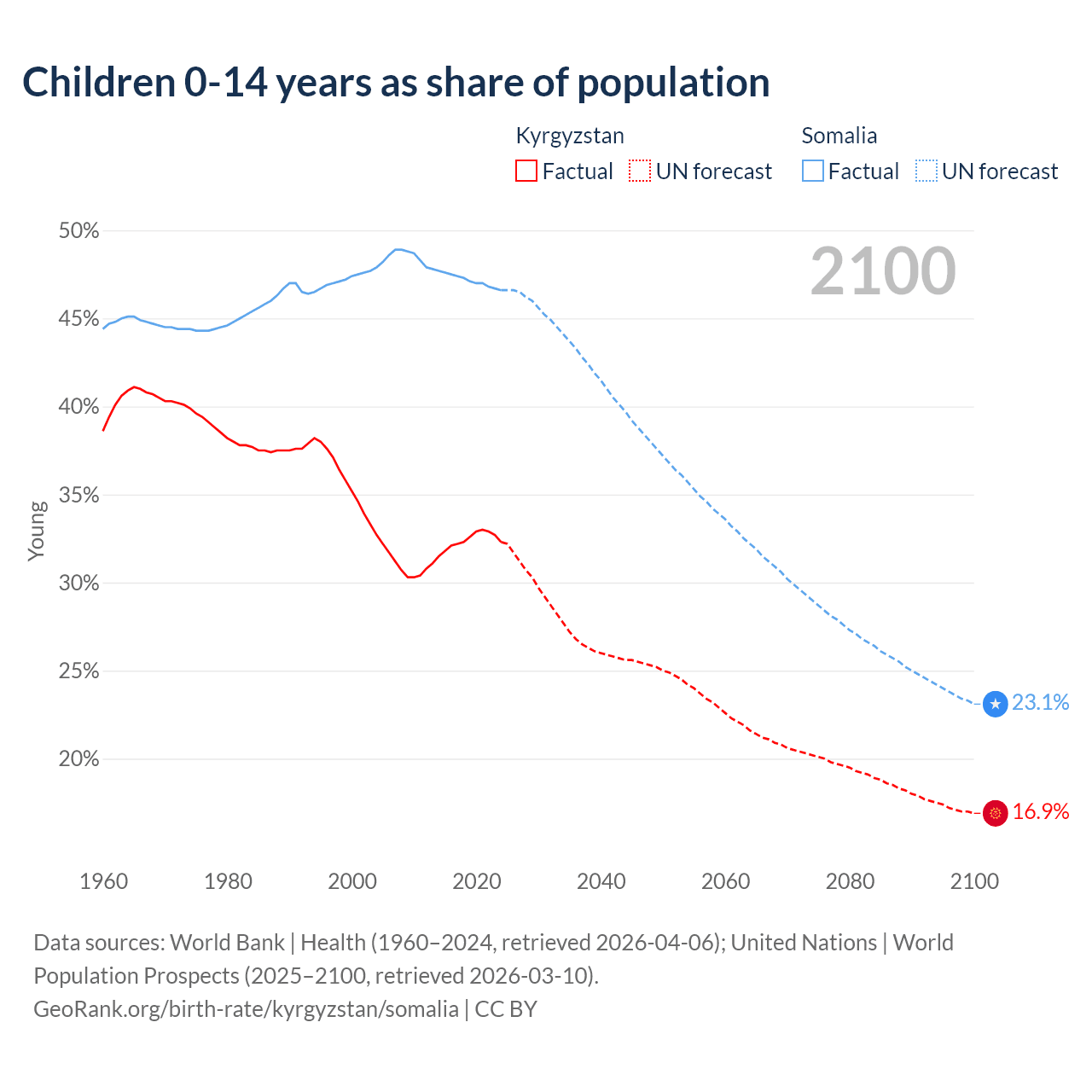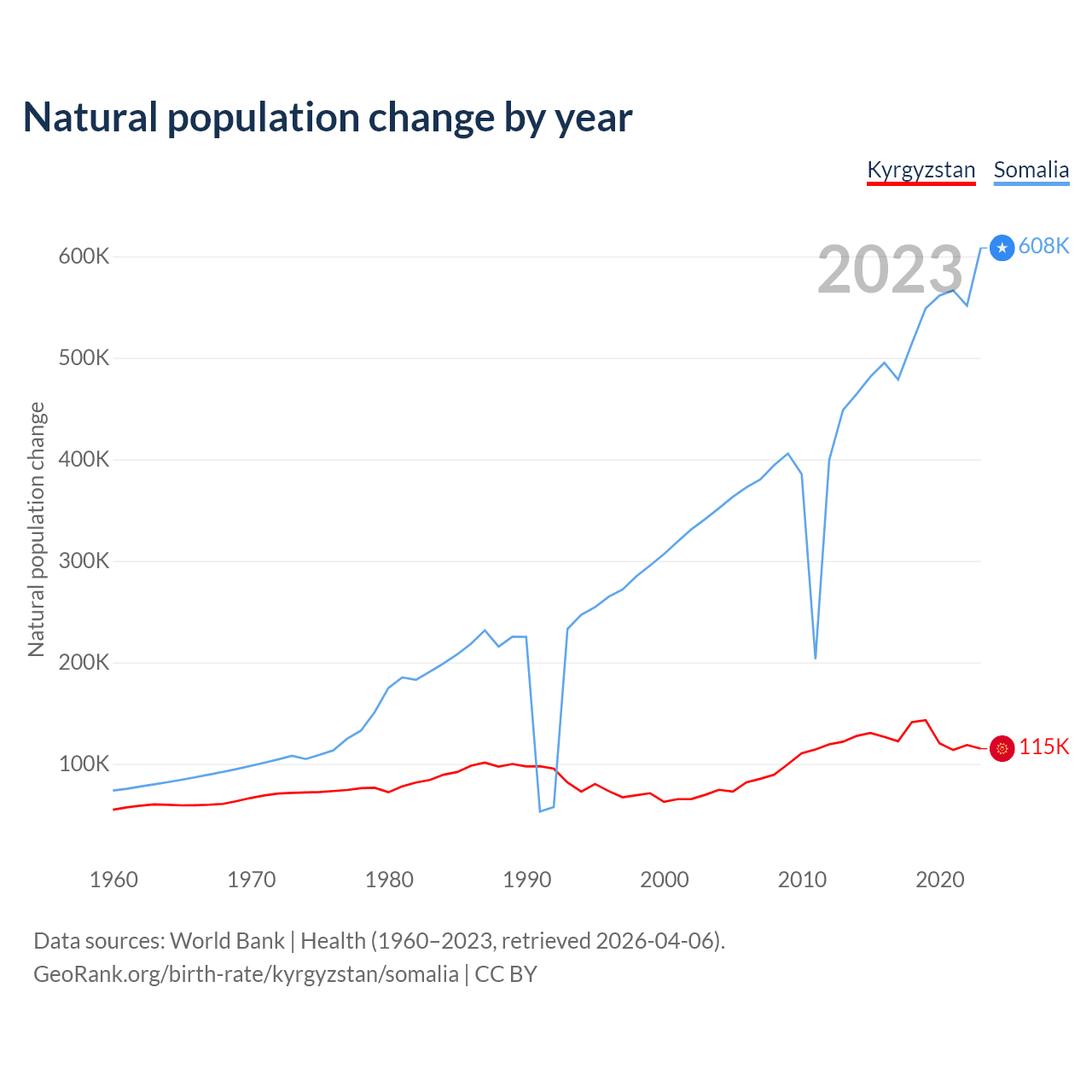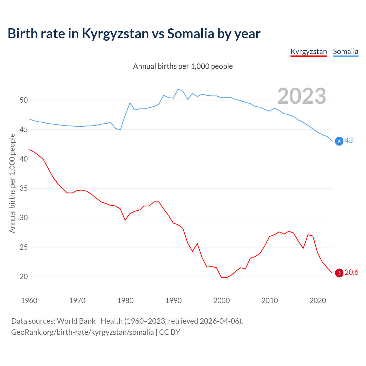 Kyrgyzstan has an annual birth rate of 20.6 births per 1,000 people, compared to 43 for Somalia. The average number of children a woman is expected to have during her lifetime — the fertility rate, is 2.7 in Kyrgyzstan and 6.13 in Somalia — 127.1% difference.