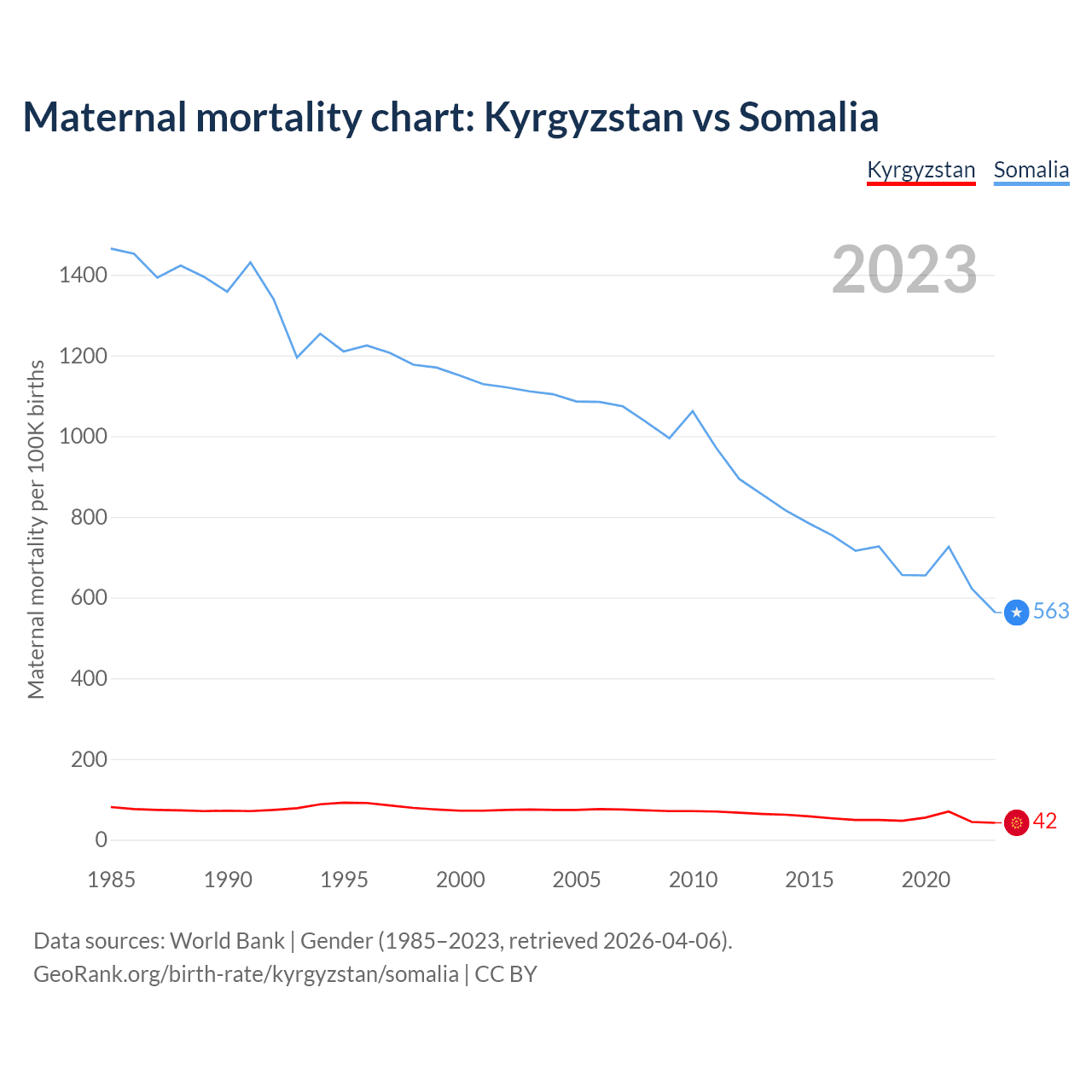 The maternal mortality rate, which is the probability of dying during childbirth or within 42 days of pregnancy termination, is 42 deaths per 100,000 live births in Kyrgyzstan, compared to 563 deaths in Somalia.