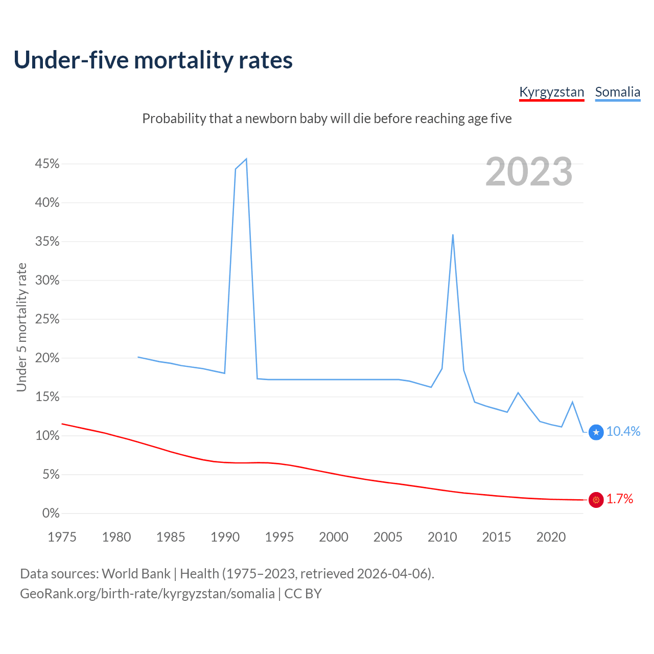 The chance that a newborn baby will die before reaching age five is 1.7% in Kyrgyzstan and 10.4% in Somalia. Above is a chart with historical data on under-five mortality rates.