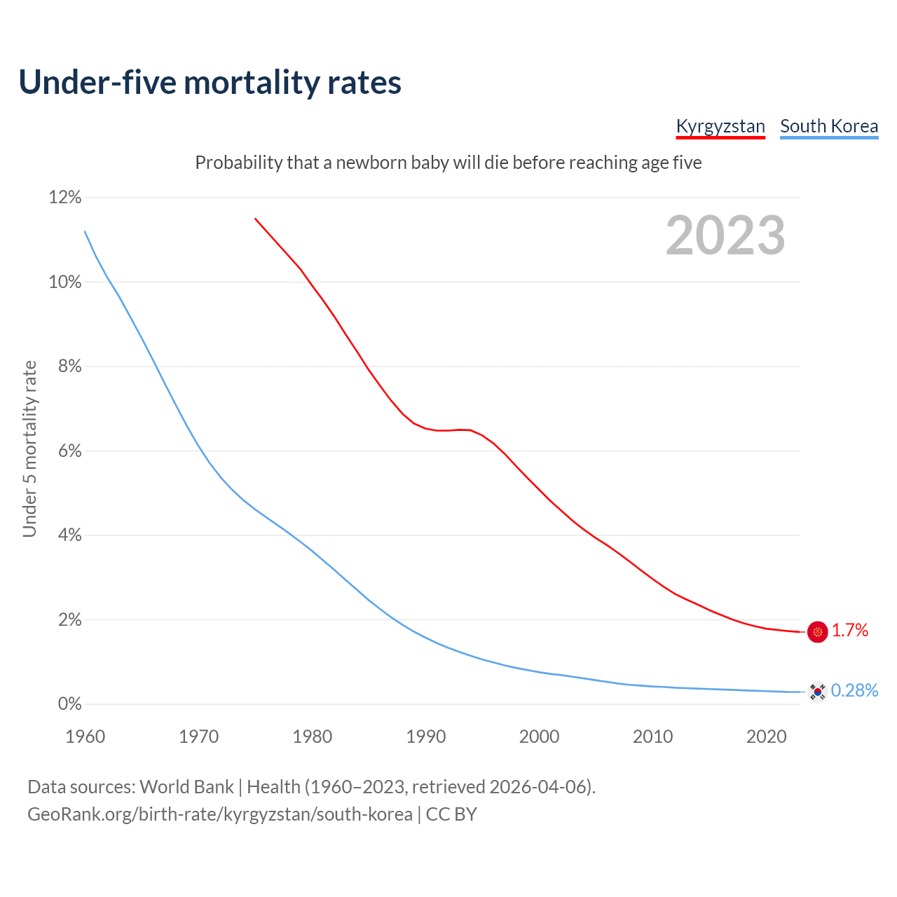 The chance that a newborn baby will die before reaching age five is 1.7% in Kyrgyzstan and 0.28% in South Korea. Above is a chart with historical data on under-five mortality rates.