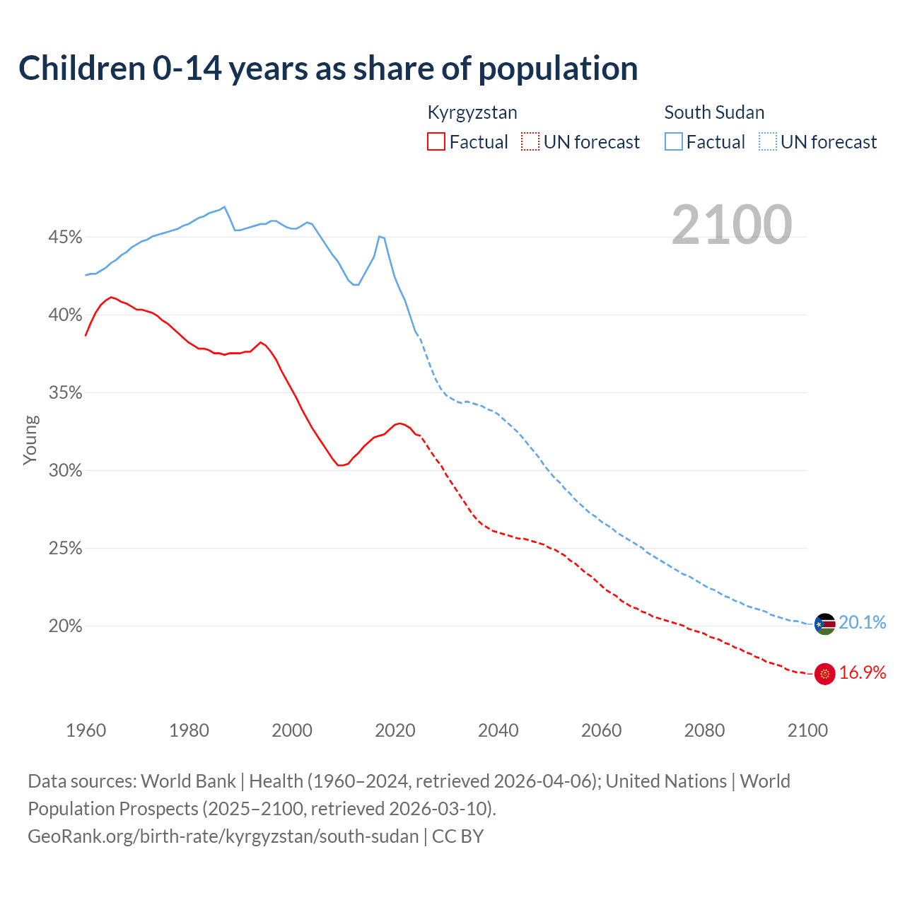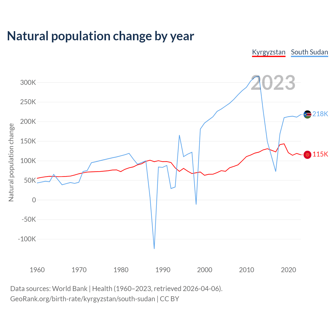 Kyrgyzstan has an annual birth rate of 20.6 births per 1,000 people, compared to 28.6 for South Sudan. The average number of children a woman is expected to have during her lifetime — the fertility rate, is 2.7 in Kyrgyzstan and 3.86 in South Sudan — 43.1% difference.