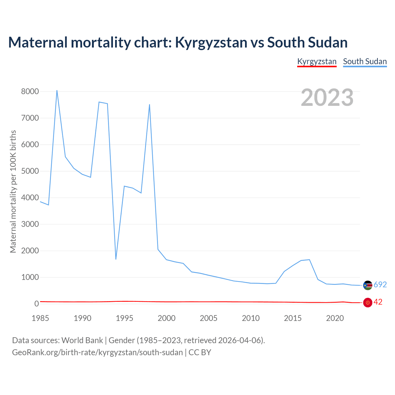 The maternal mortality rate, which is the probability of dying during childbirth or within 42 days of pregnancy termination, is 42 deaths per 100,000 live births in Kyrgyzstan, compared to 692 deaths in South Sudan.