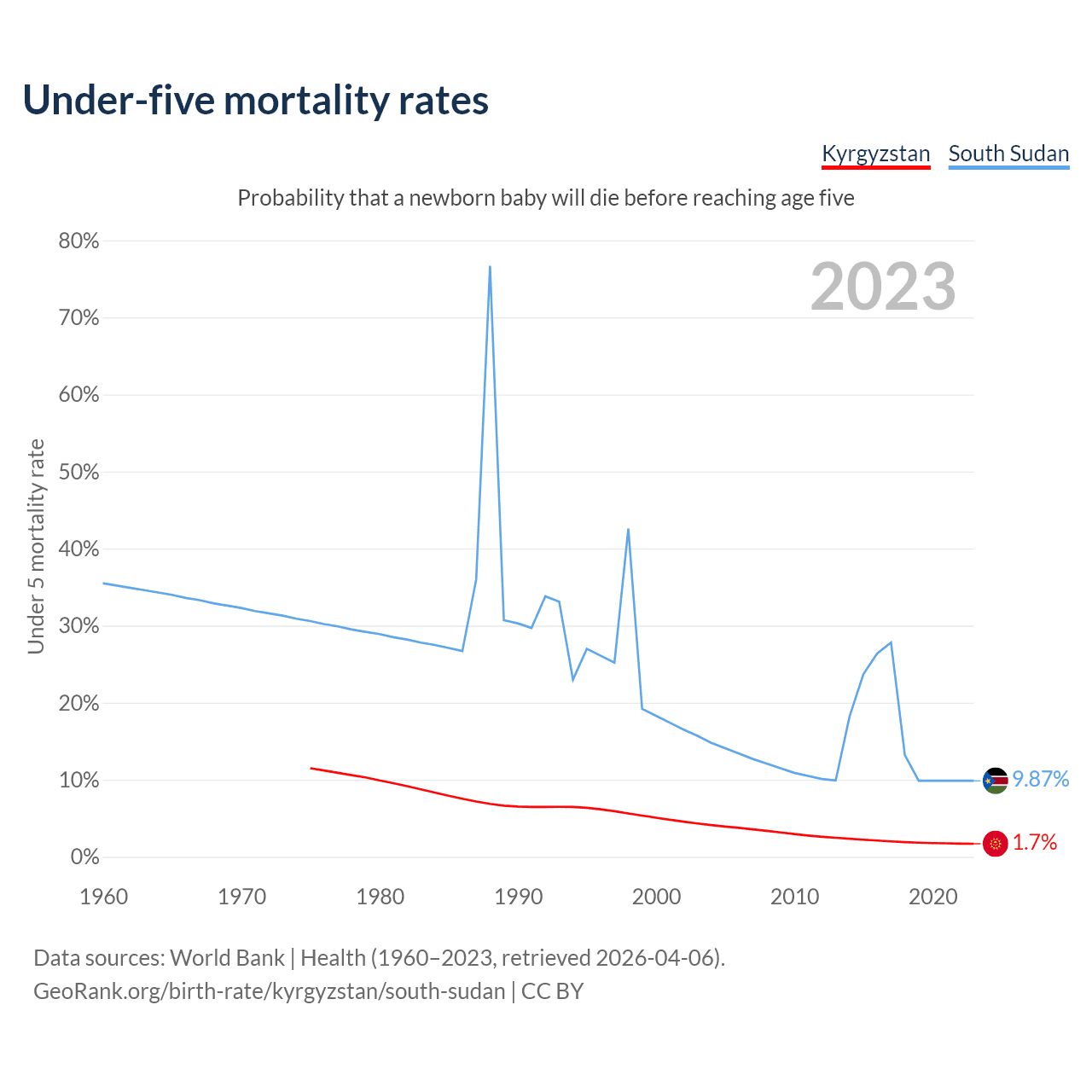The chance that a newborn baby will die before reaching age five is 1.7% in Kyrgyzstan and 9.87% in South Sudan. Above is a chart with historical data on under-five mortality rates.