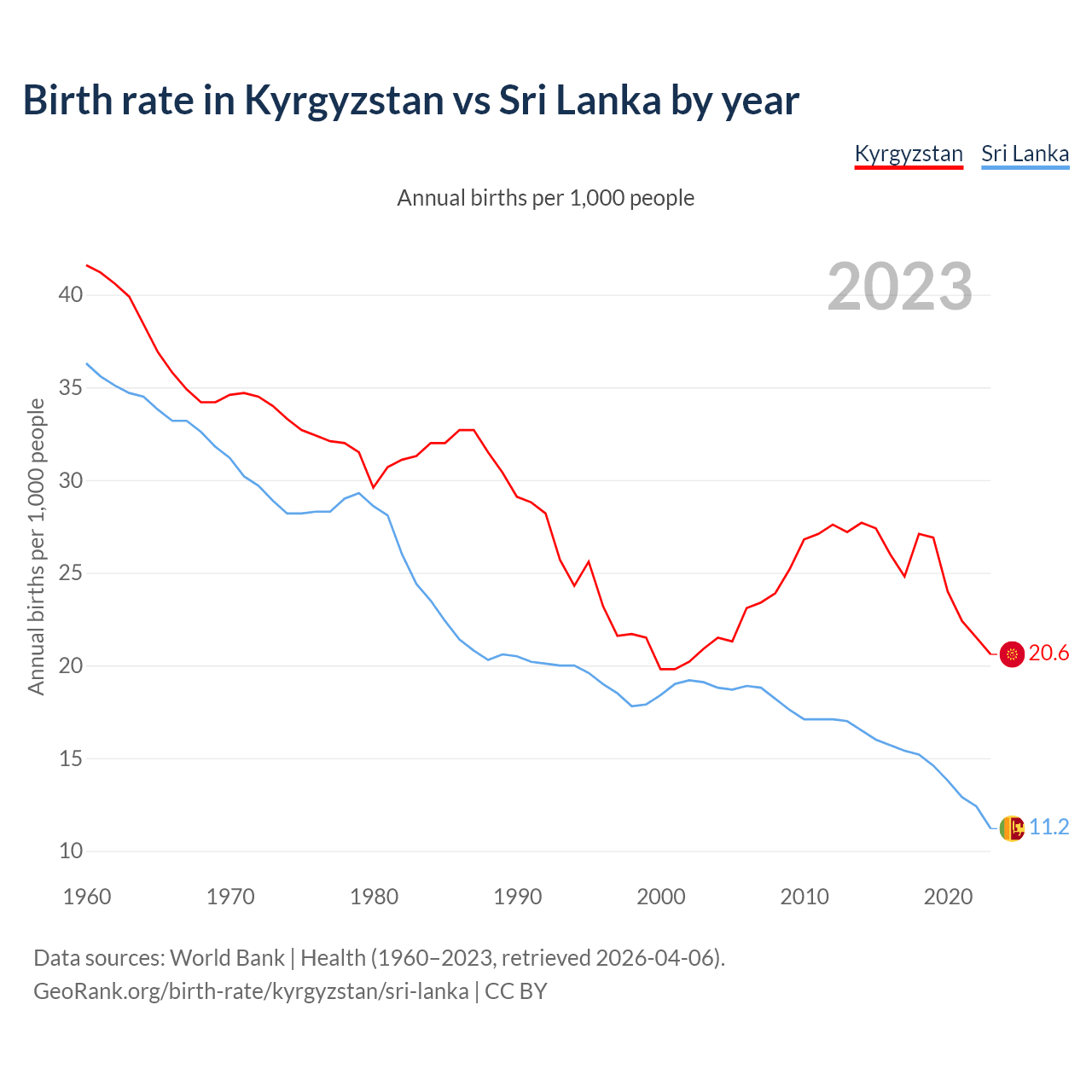 Kyrgyzstan has an annual birth rate of 20.6 births per 1,000 people, compared to 11.2 for Sri Lanka. The average number of children a woman is expected to have during her lifetime — the fertility rate, is 2.7 in Kyrgyzstan and 1.97 in Sri Lanka — 26.9% difference.
