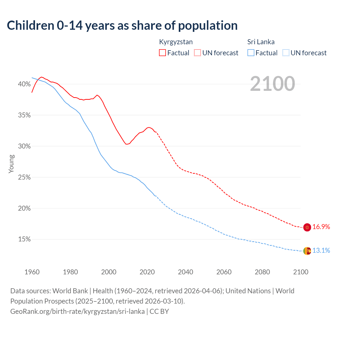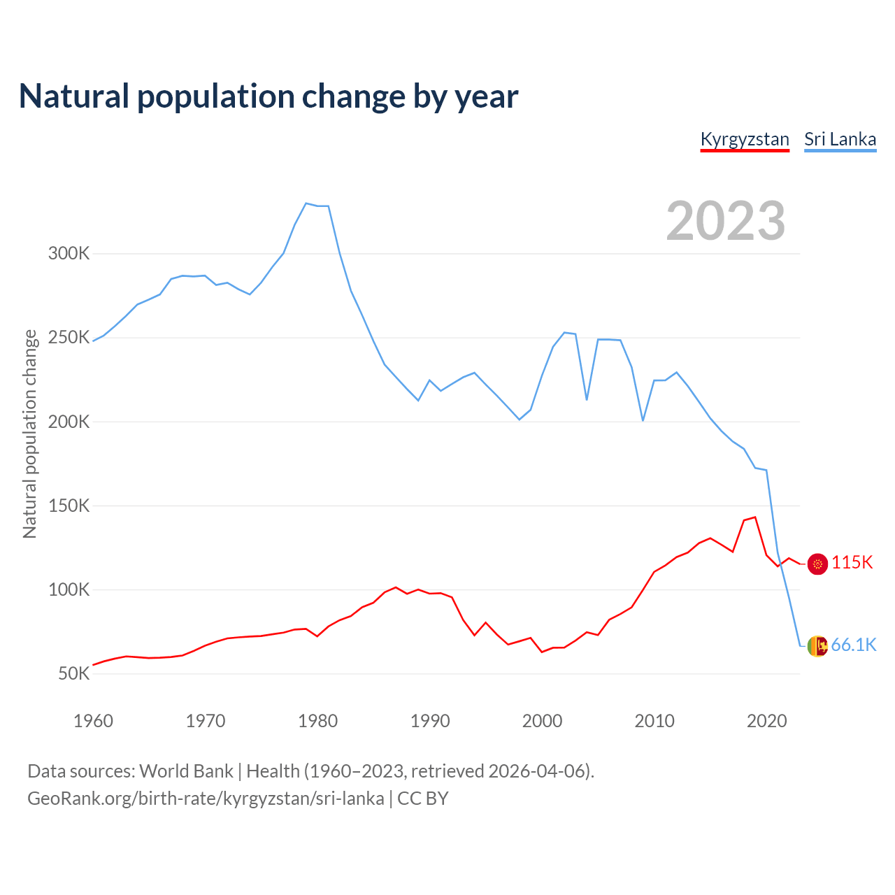 According to the latest available data on birth rates, the fertility rate in Kyrgyzstan was 2.7 children per woman in 2023, compared to 1.97 in Sri Lanka in 2023. The replacement level is considered to be 2.1 children per woman.