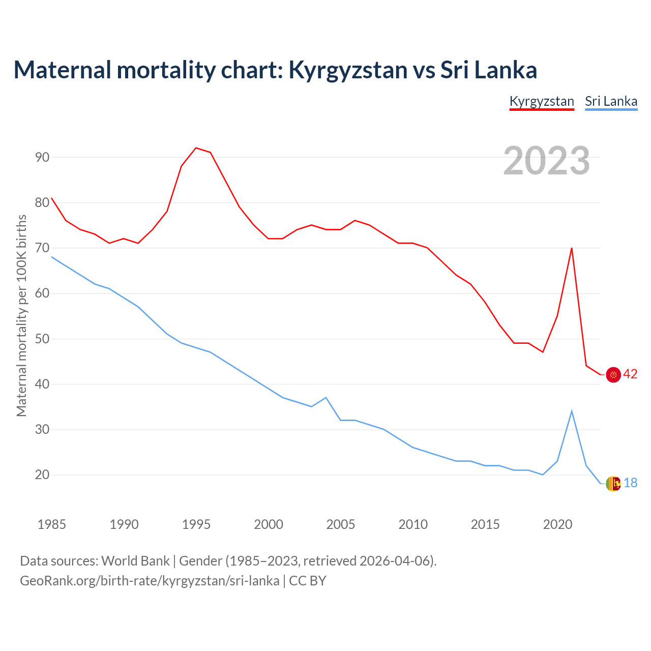 The maternal mortality rate, which is the probability of dying during childbirth or within 42 days of pregnancy termination, is 42 deaths per 100,000 live births in Kyrgyzstan, compared to 18 deaths in Sri Lanka.