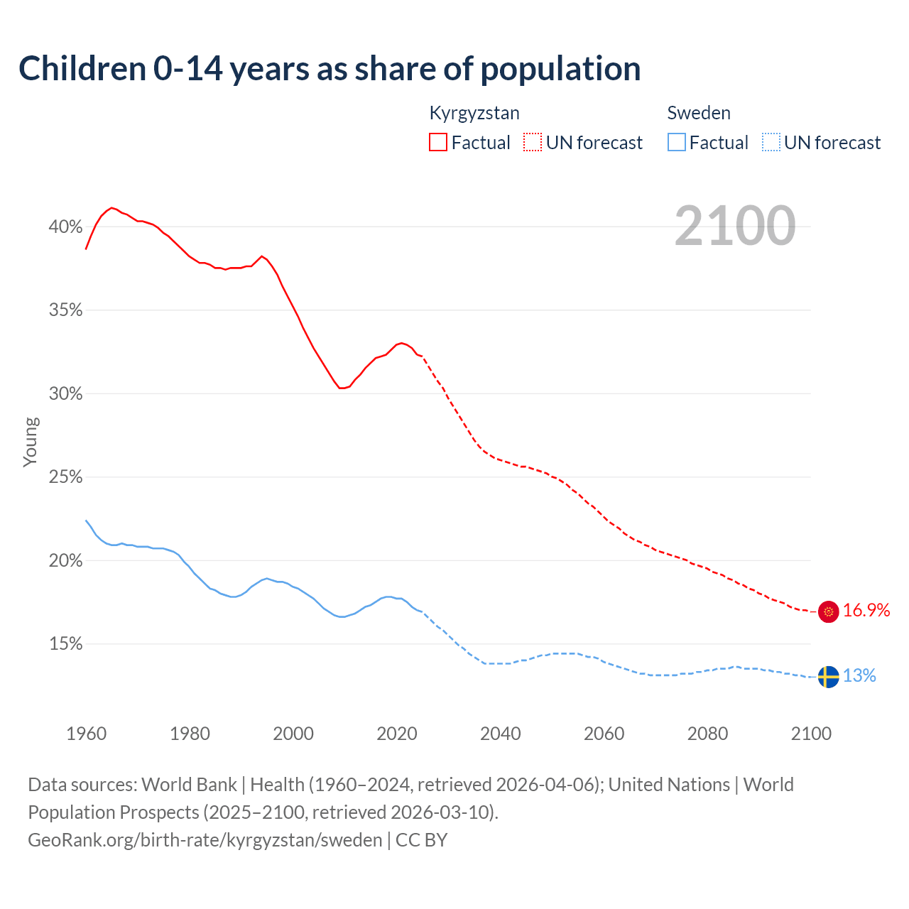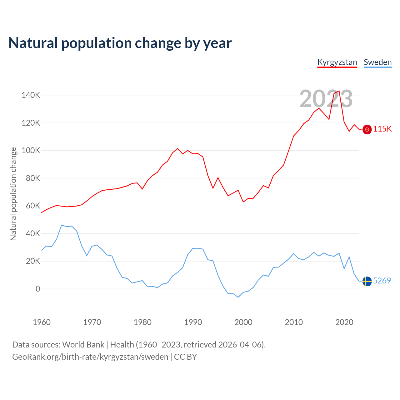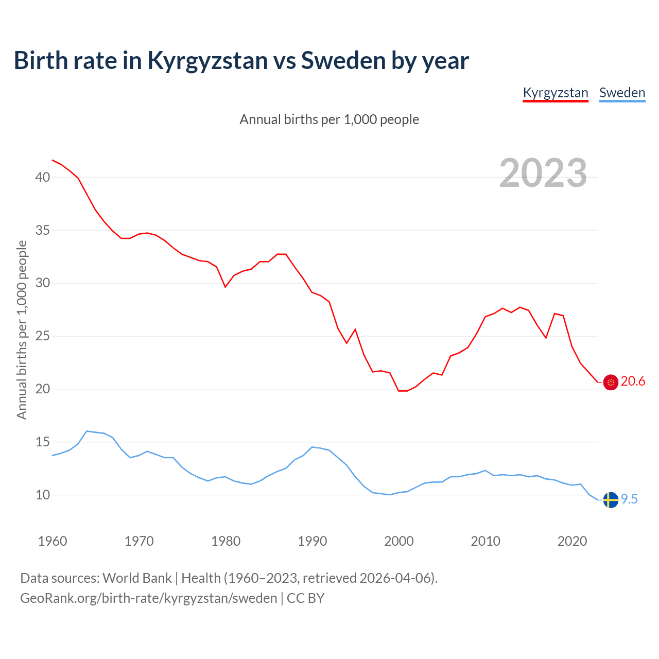 Kyrgyzstan has an annual birth rate of 20.6 births per 1,000 people, compared to 9.5 for Sweden. The average number of children a woman is expected to have during her lifetime — the fertility rate, is 2.7 in Kyrgyzstan and 1.45 in Sweden — 46.3% difference.