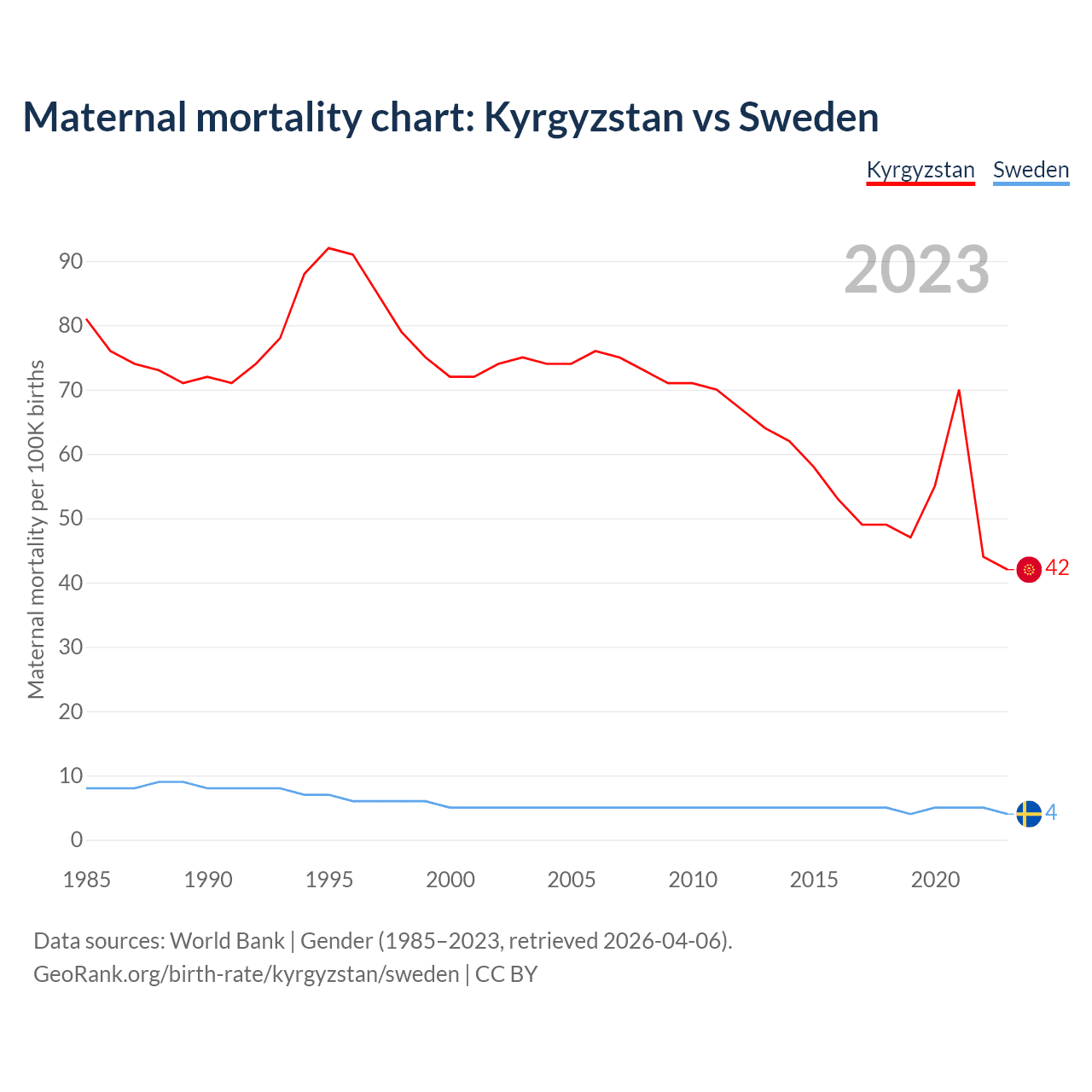 The maternal mortality rate, which is the probability of dying during childbirth or within 42 days of pregnancy termination, is 42 deaths per 100,000 live births in Kyrgyzstan, compared to 4 deaths in Sweden.