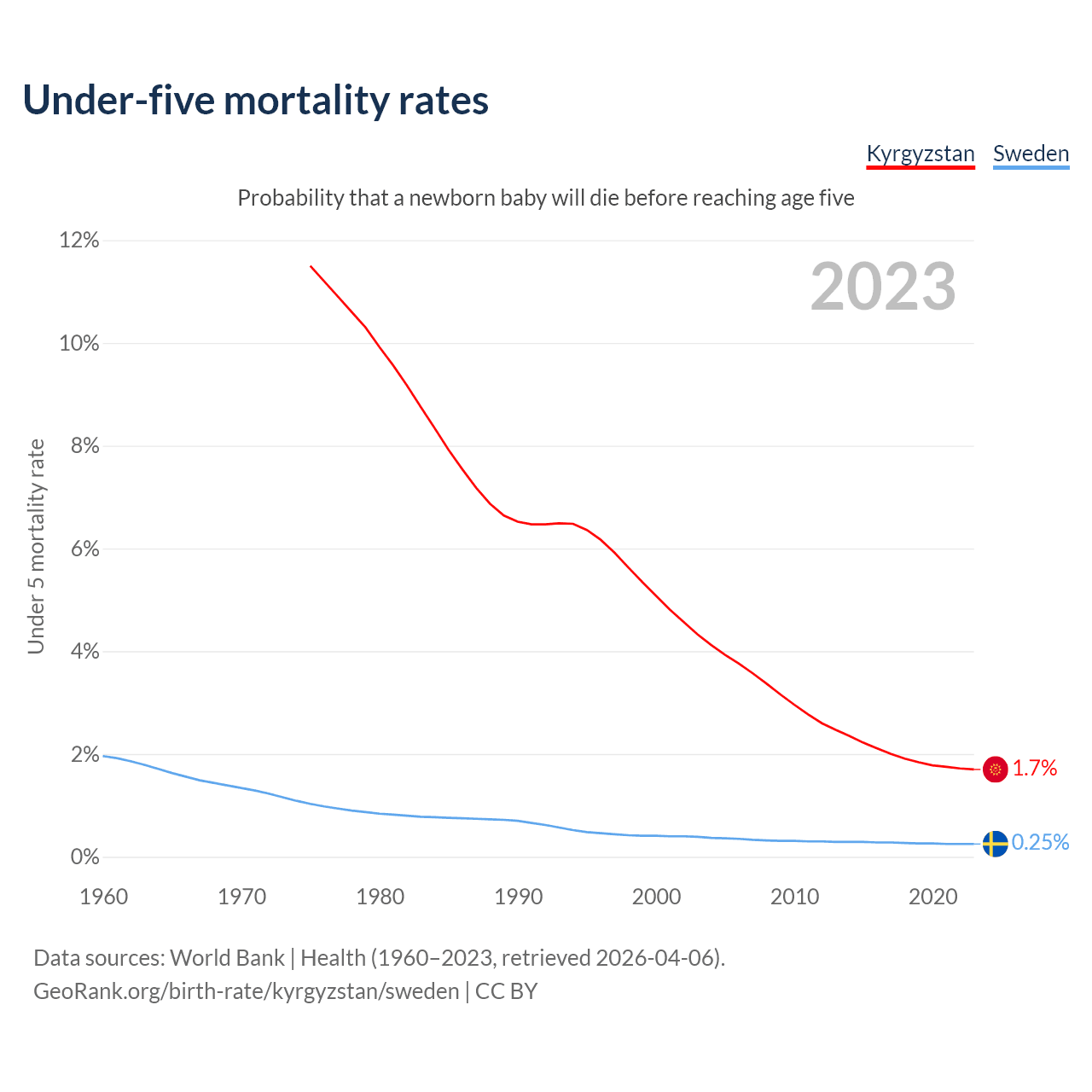 The chance that a newborn baby will die before reaching age five is 1.7% in Kyrgyzstan and 0.25% in Sweden. Above is a chart with historical data on under-five mortality rates.