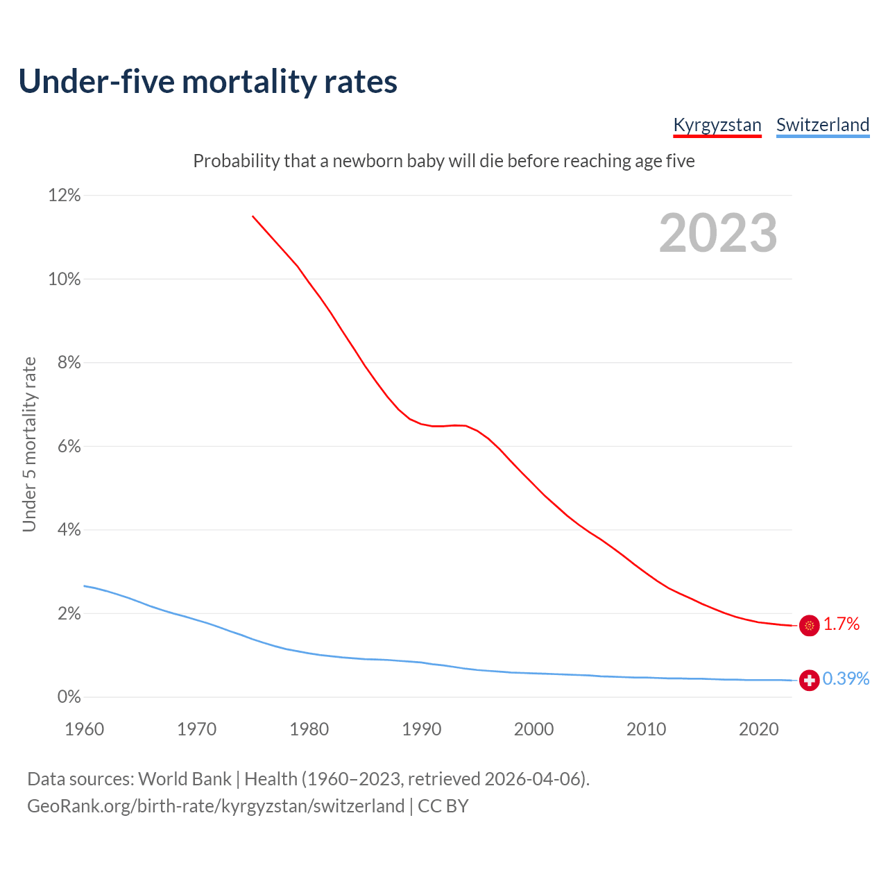 The chance that a newborn baby will die before reaching age five is 1.7% in Kyrgyzstan and 0.39% in Switzerland. Above is a chart with historical data on under-five mortality rates.