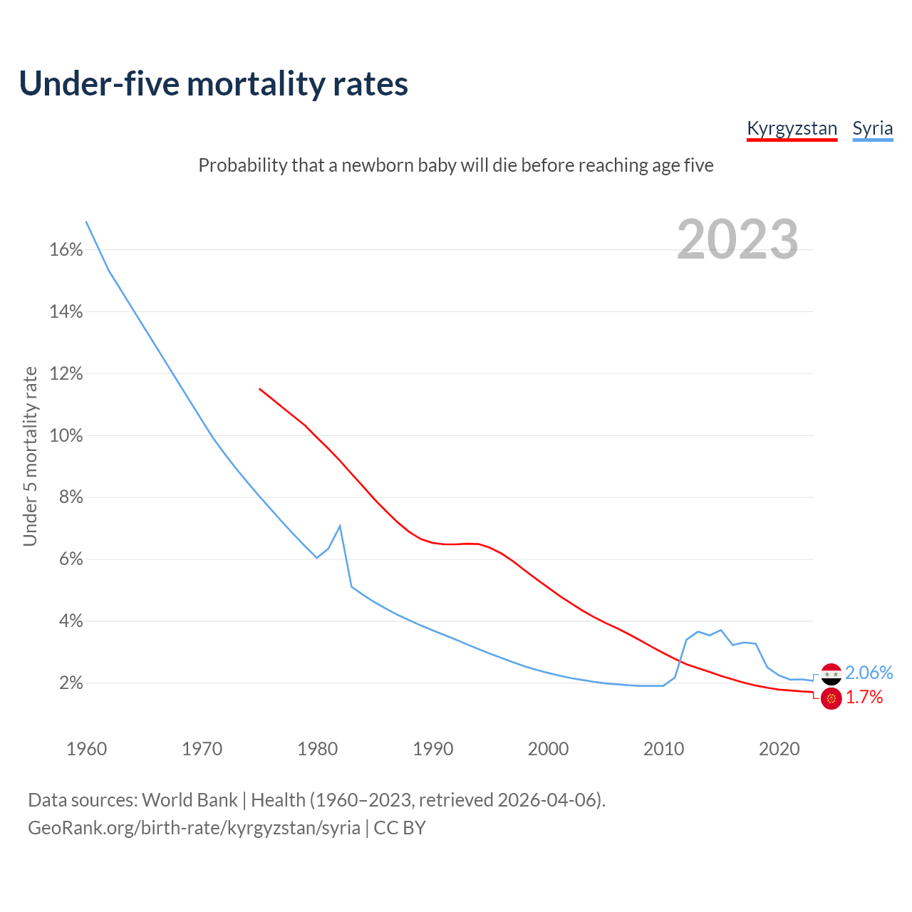 The chance that a newborn baby will die before reaching age five is 1.7% in Kyrgyzstan and 2.06% in Syria. Above is a chart with historical data on under-five mortality rates.